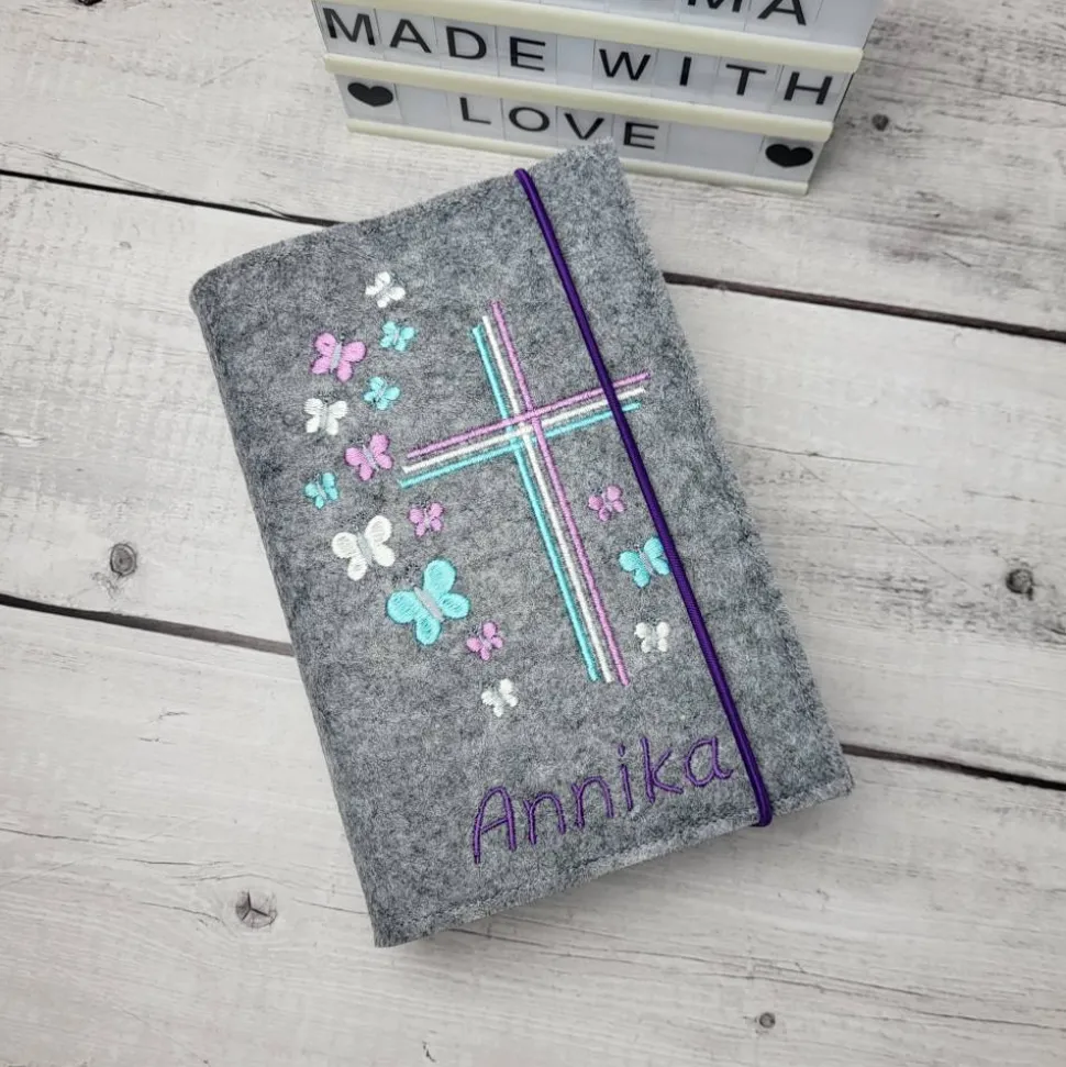 Hochwertige Gotteslobhülle aus Polyesterfilz (3,0 mm), bestickt mit einem Kreuz und Schmetterlingen (gerne auch mit dem Namen und Datum) mit passendem Rosenkranztäschchen.