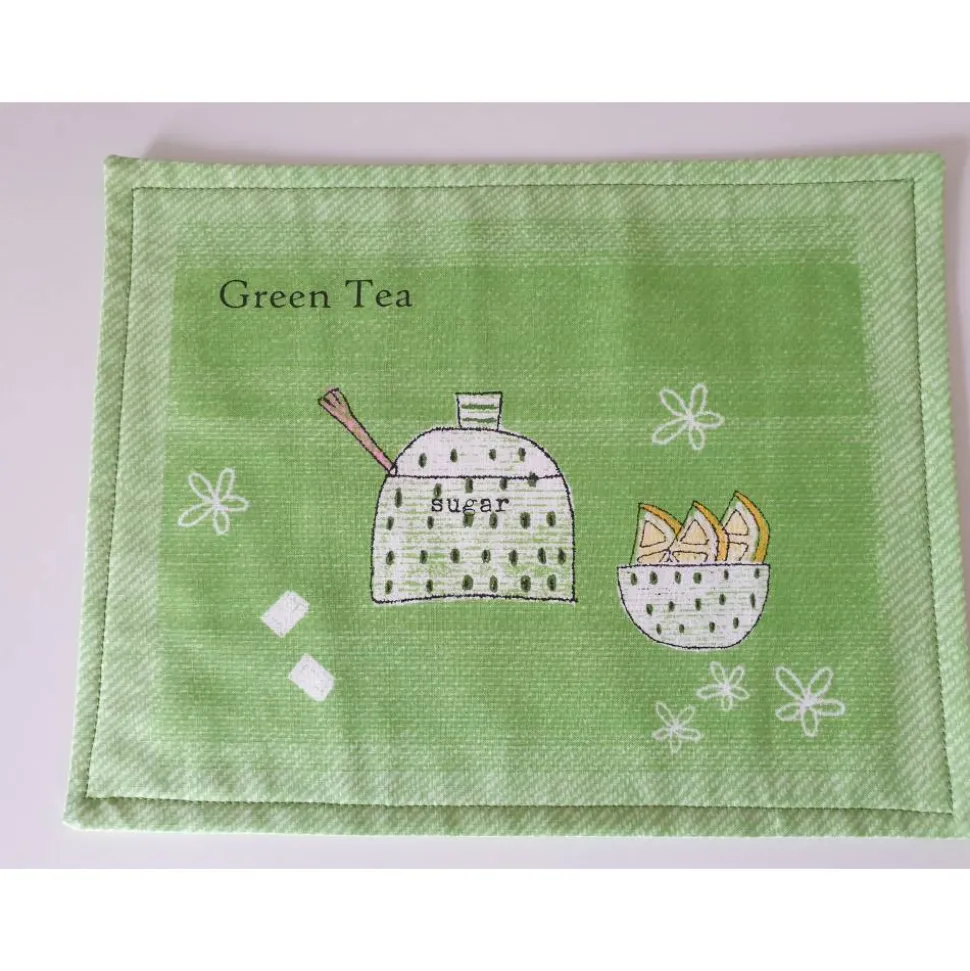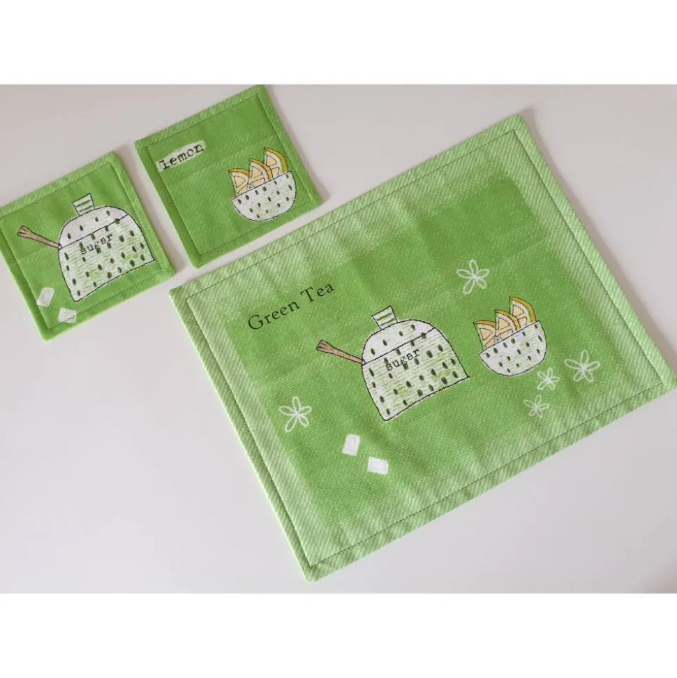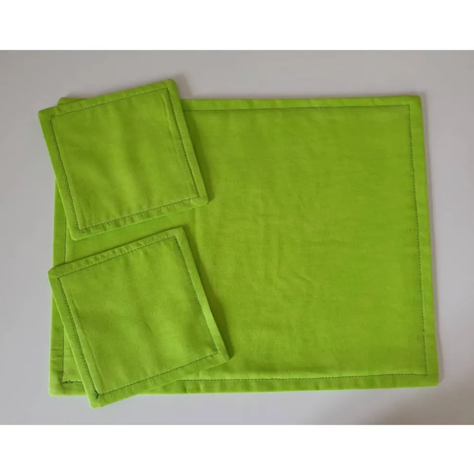 Das Set und die beiden Untersetzter sind aus hochwertigem Baumwollstoff genäht. Als Einlage dient ein altes Baumwollleintuch.