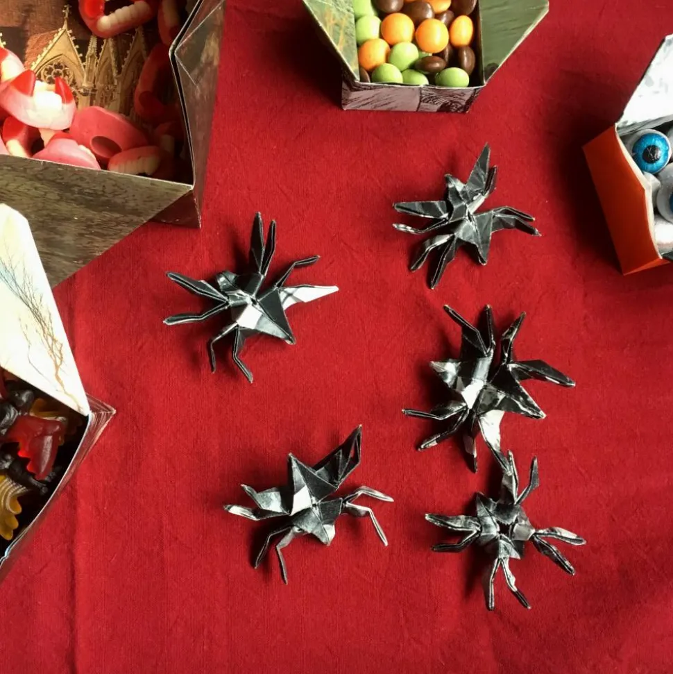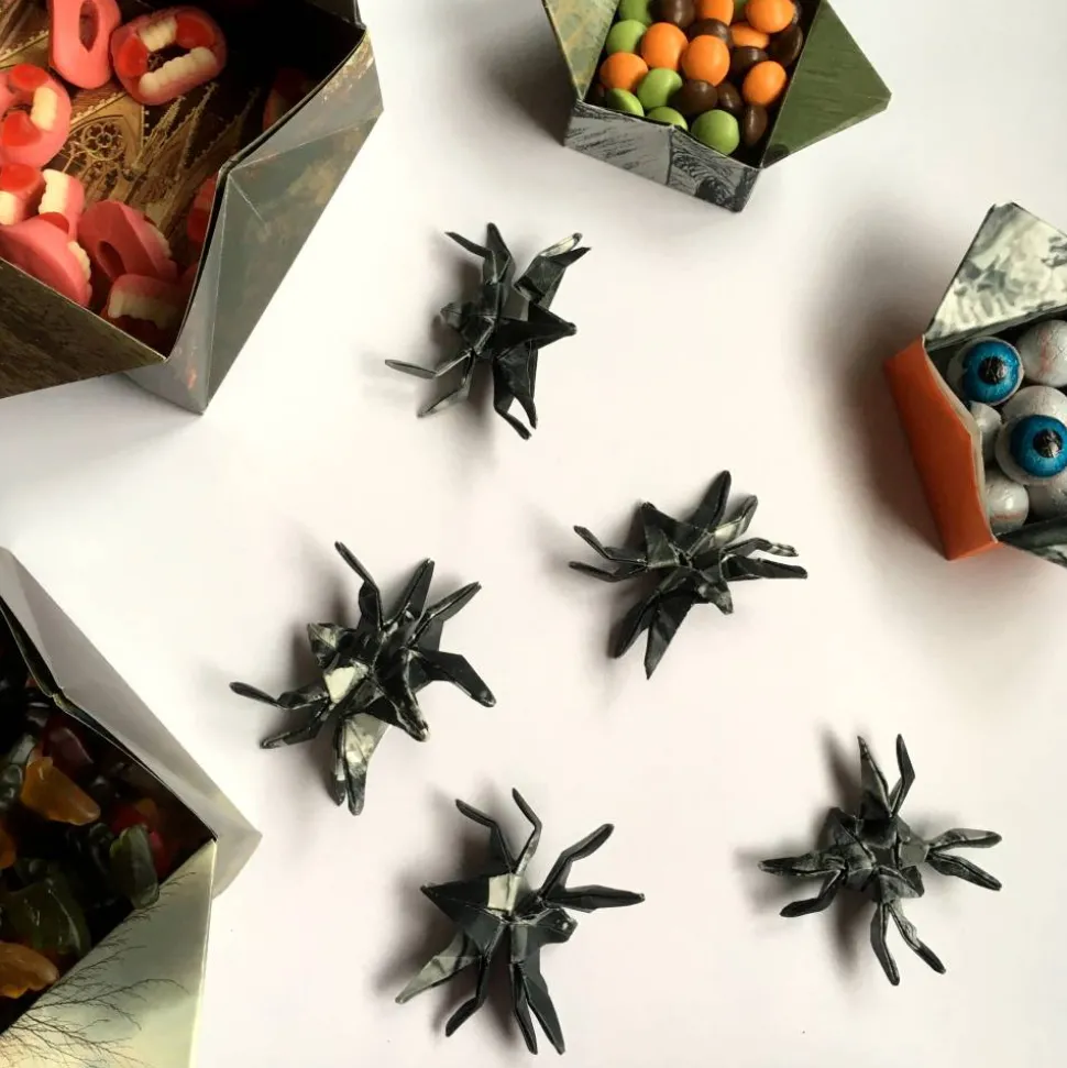 Verschiedene Sets an Origami Deko mit Spinnen, Geistern, Eule, Teufel, Kürbis, Mond und Fledermäusen fürs Fenster oder als Tischdeko. Außerdem Origami-Boxen für Süßigkeiten