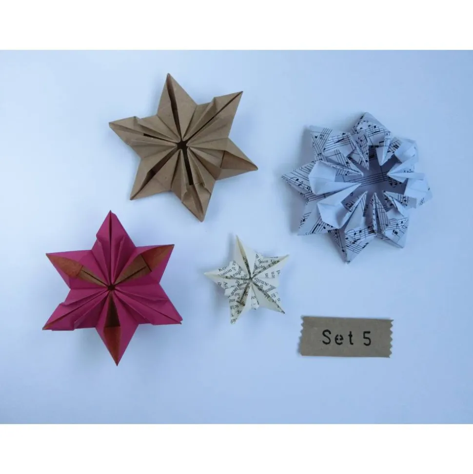 Verschiedene Sets an Origami Sternen fürs Fenster oder als Tischdeko, teilweise als Teelichthalter geeignet. Mit Teelicht keinesfalls unbeaufsichtigt brennen lassen, da das Papier brennbar ist.