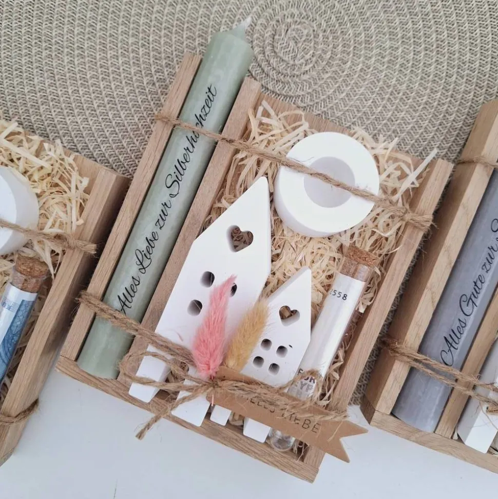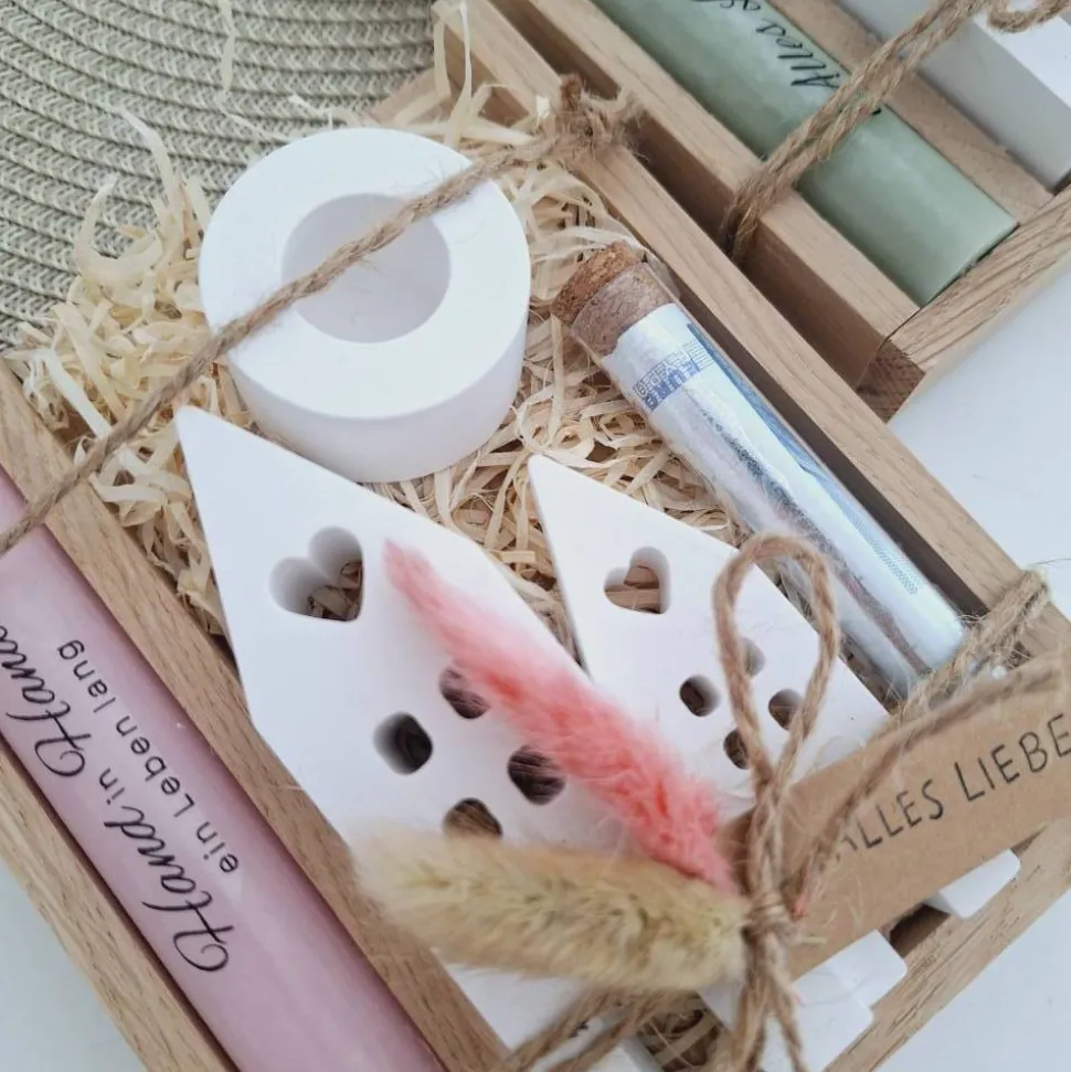 Das Geschenkset wird in einer Holzbox zusammengebunden, mit Trockenblumen (können variieren) verziert und mit einem Anhänger “ ALLES LIEBE “ ergänzt.
