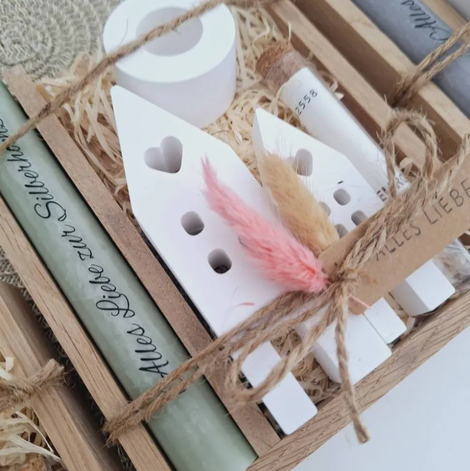Das Kerzenset besteht aus einer Kerze (in der Farbe deiner Wahl) mit einer Aufschrift deiner Wahl, einem passenden runden Kerzenhalter und zwei Häuser / Lichthäuser.
