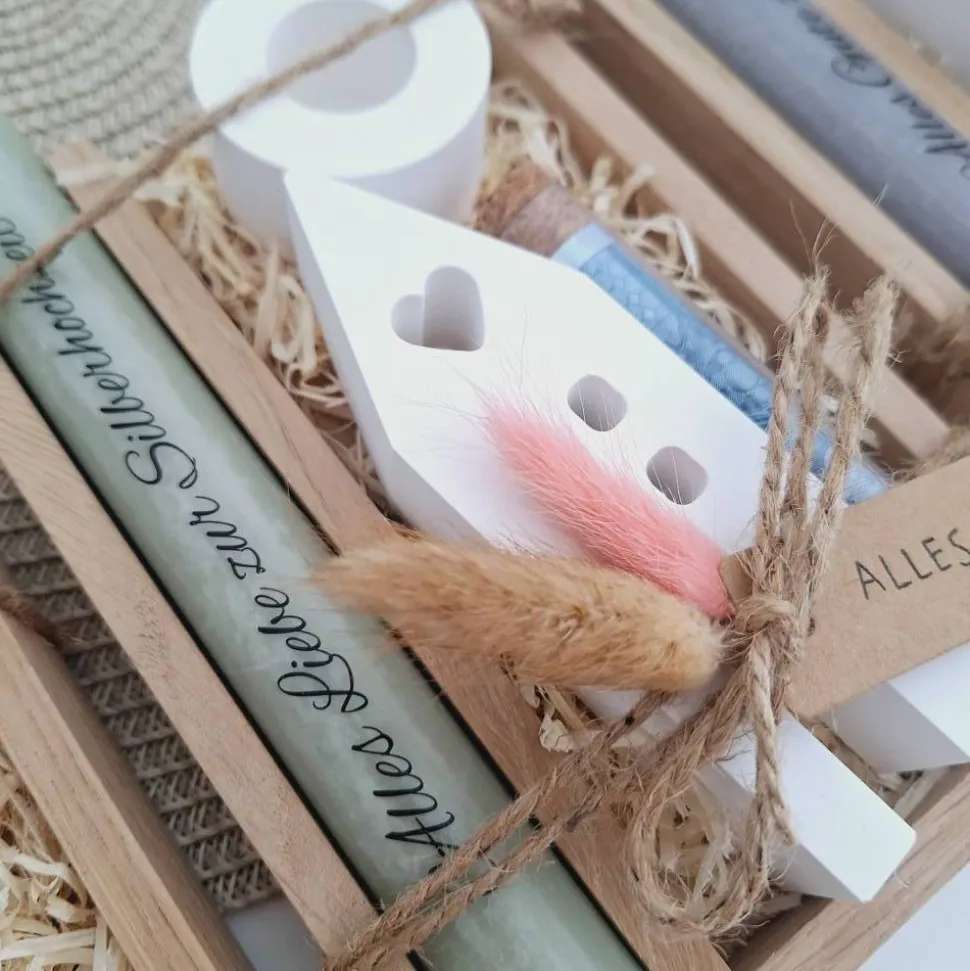Das Geschenkset wird in einer Holzbox zusammengebunden, mit Trockenblumen (können variieren) verziert und mit einem Anhänger “ ALLES LIEBE “ ergänzt.