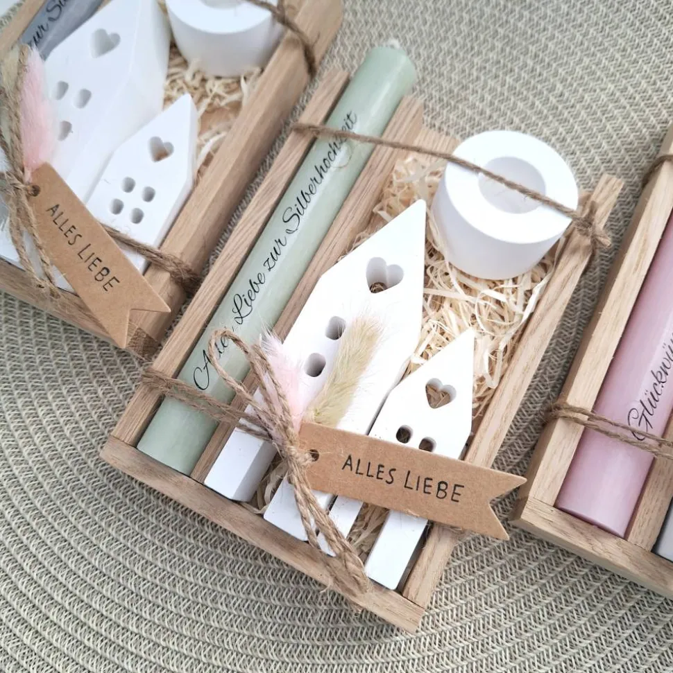Das Geschenkset wird in einer Holzbox zusammengebunden, mit Trockenblumen (können variieren) verziert und mit einem Anhänger “ ALLES LIEBE “ ergänzt.