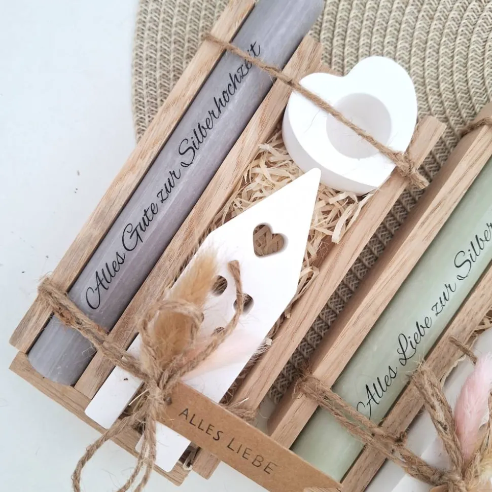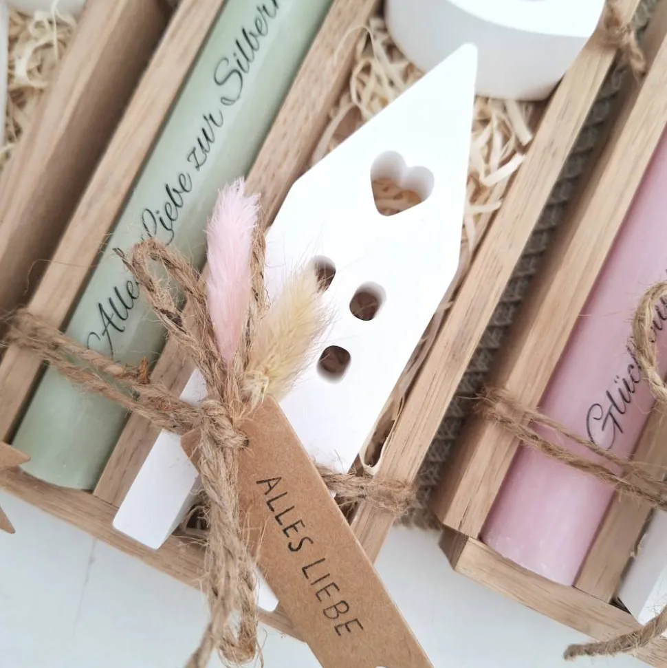 Das Geschenkset wird in einer Holzbox zusammengebunden, mit Trockenblumen (können variieren) verziert und mit einem Anhänger “ ALLES LIEBE “ ergänzt.