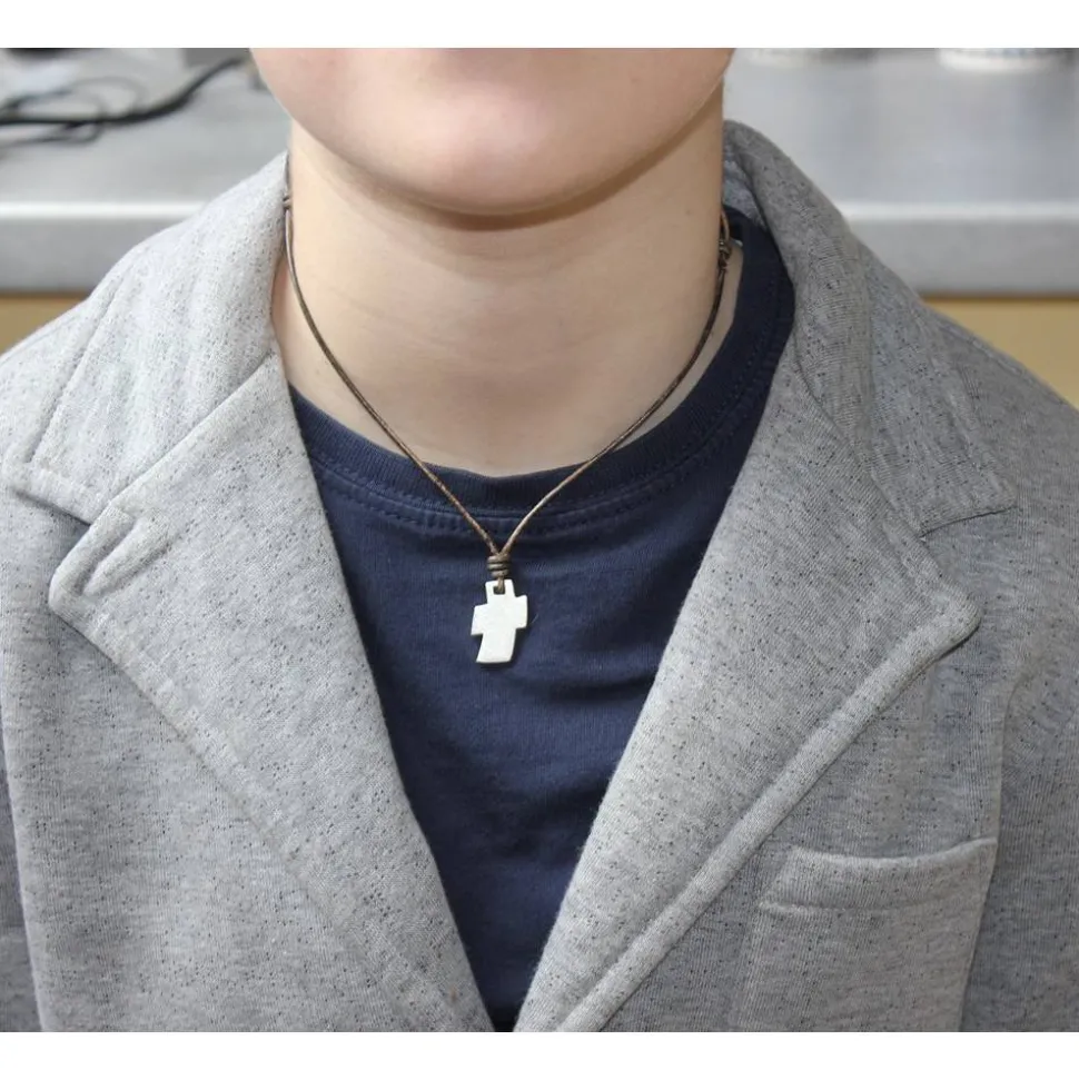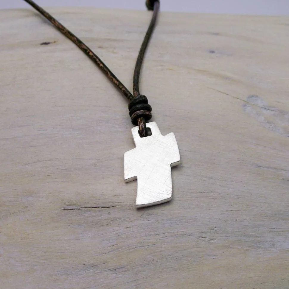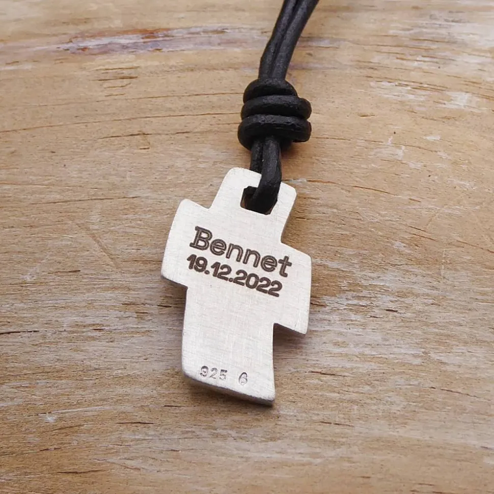 Ein Silberkreuz mit Schwung, in der Formgebung sehr schlicht und doch auffallend. Dieses frische Schmuckstück kann graviert werden und wäre somit das ideale Geschenk zur Kommunion, Konfirmation oder Firmung. Die Oberfläche ist matt, die Farbe des Lederbandes kann gewählt werden.