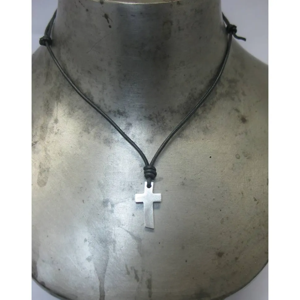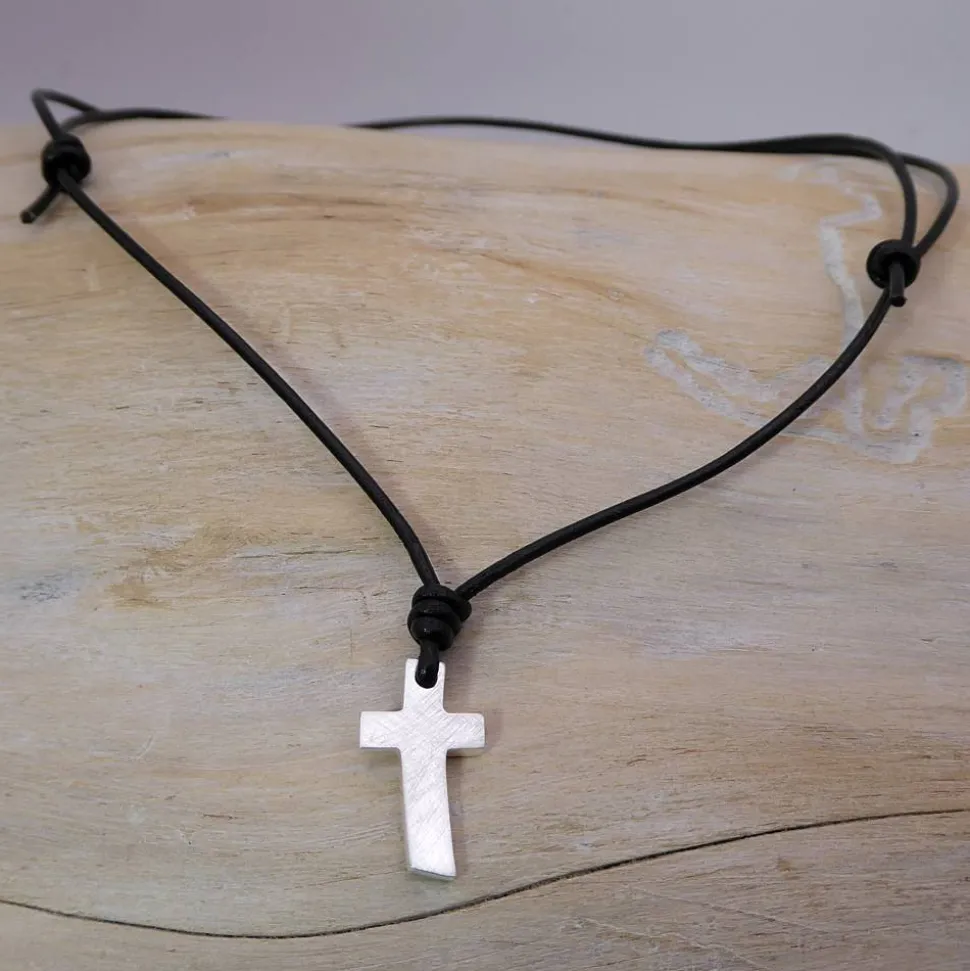 Einfach und schlicht in der Form – durch die Materialstärke wirkt dieses Kreuz dennoch robust und massiv. Diese kleine Variante ist speziell für Kommunionkinder angefertigt. Passend zum etwas rauen Charme des Schmuckstücke ist das Lederband mit einem Henkerknoten an das Kreuz geknüpft.