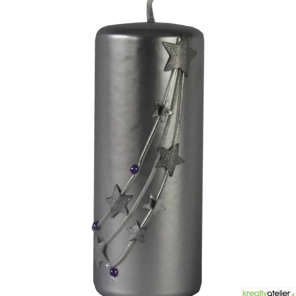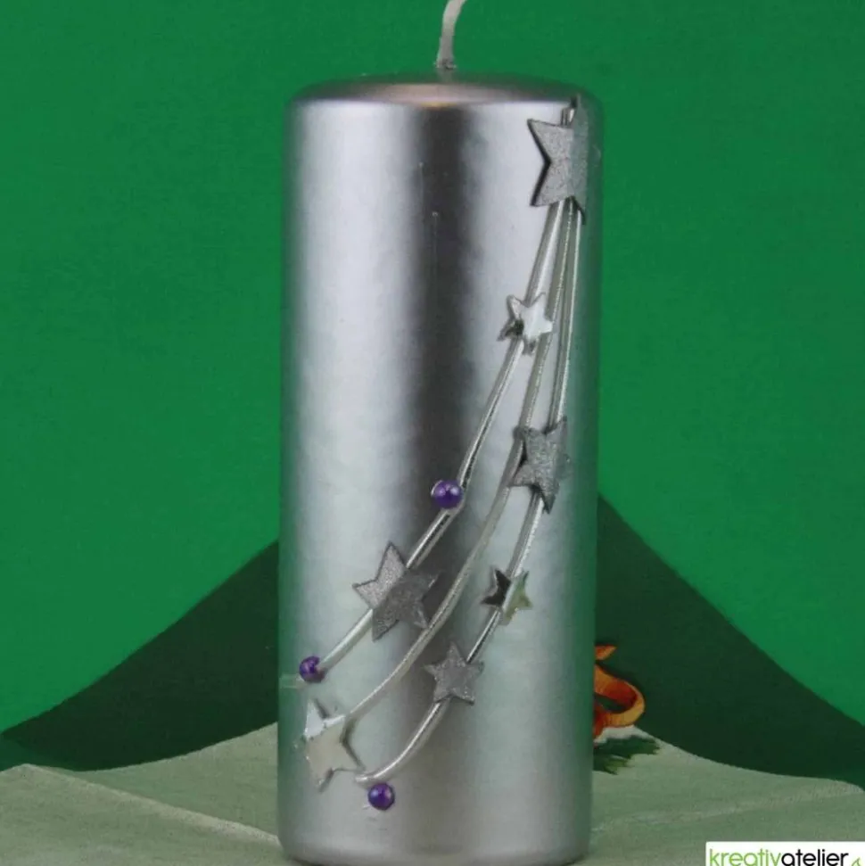 Meine Weihnachtskerzen werden aufwändig von Hand mit Wachs verziert. Zunächst wurde die Oberfläche dieser Kerze mit einer Kerzenfolie in silber überzogen. Silberne Rundstreifen, die schräg von unten nach oben über die Kerze verlaufen, bilden die Basis für Sterne. Die Sterne werden einzeln und von Hand aus verschiedenen silbernen Wachsplatten ausgeschnitten und zu dem Gesamtbild auf der Weihnachtskerze kunstvoll arrangiert. Kleine violette Halbperlen runden dieses Gesamtbild sehr schön ab.