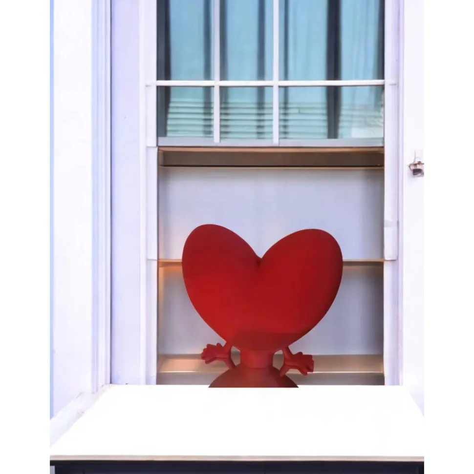 Die Figur besteht aus einem satten, roten Herz-Körper mit niedlichen, beweglichen Beinen und kleinen Händen, die ihr den besonderen Charme verleihen. Sie ist speziell dafür konzipiert, auf einer Kante oder einem Regal zu sitzen, wobei die Beine frei baumeln – ein absoluter Blickfang in jedem Raum!