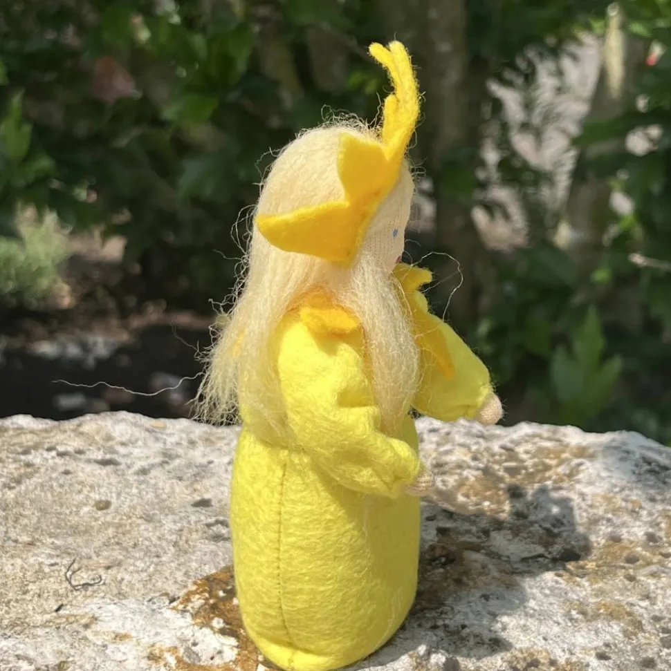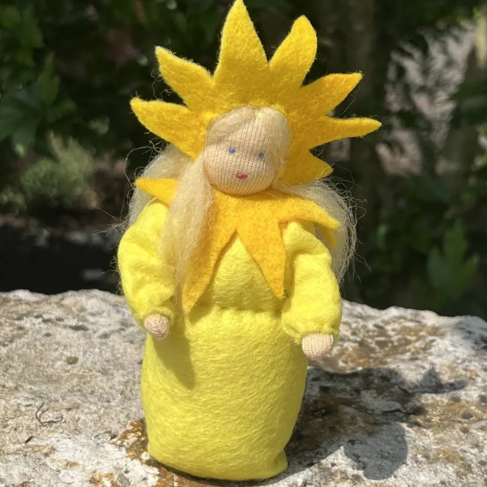 Sie sind ca 12 cm groß. Der Sonnenstrahlen kranz auf dem Kopf und der Kragen sind aus meliertem Wollfilz genäht.
