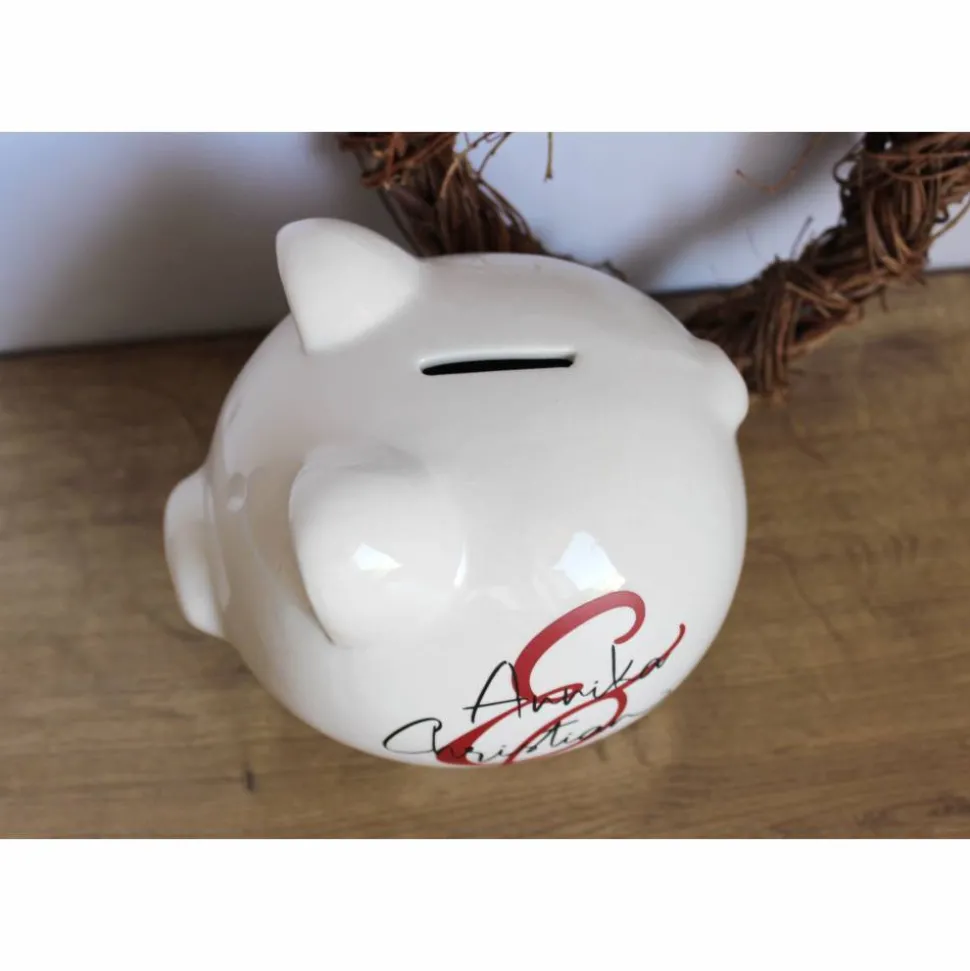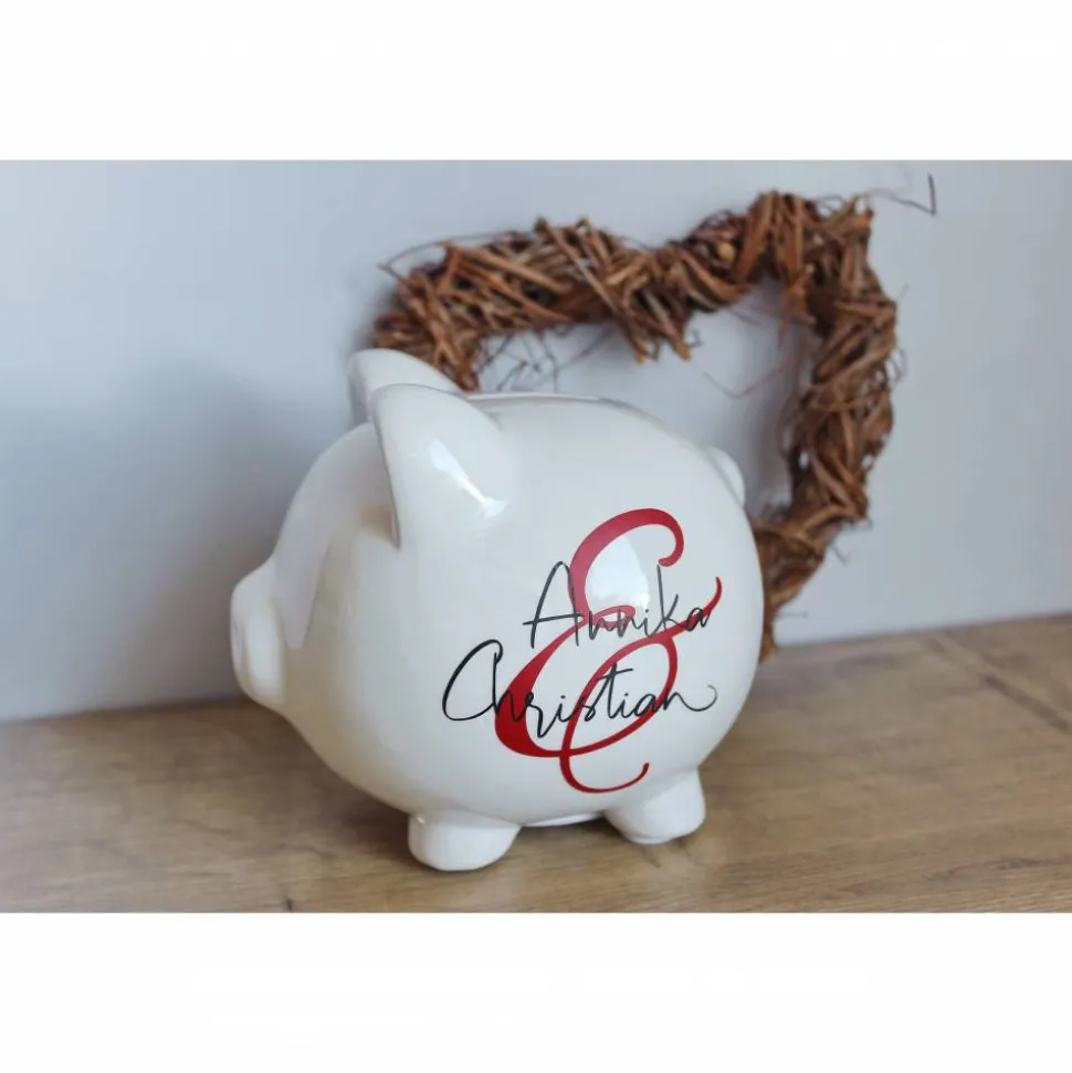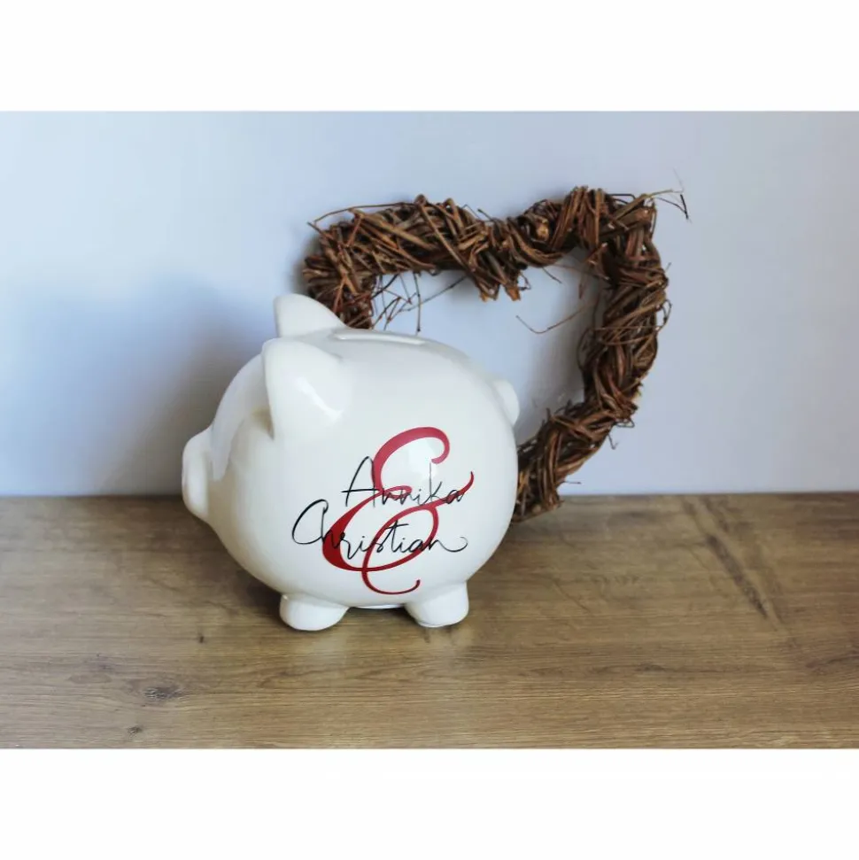 Das Sparschwein ist ein einem Cremeton (kein reines weiß!) und mit einem Plastikverschluss an der Unterseite versehen. Dadurch kann das Geld entnommen werden, ohne das Sparschwein kaputt machen zu müssen und kann von dem Brautpaar als Erinnerung aufgehoben oder für das gemeinsame Sparen weiterverwendet werden.