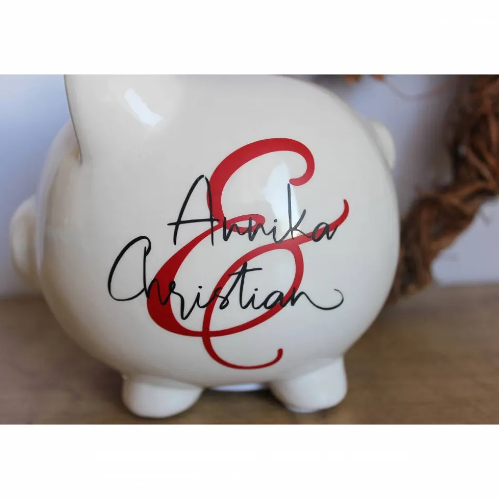 Der Schriftzug wird individuell mit den Namen des Brautpaars erstellt, aus schwarzer Folie geplottet und auf einem großen „&“-Zeichen in rot auf das Sparschwein aufgeklebt.
