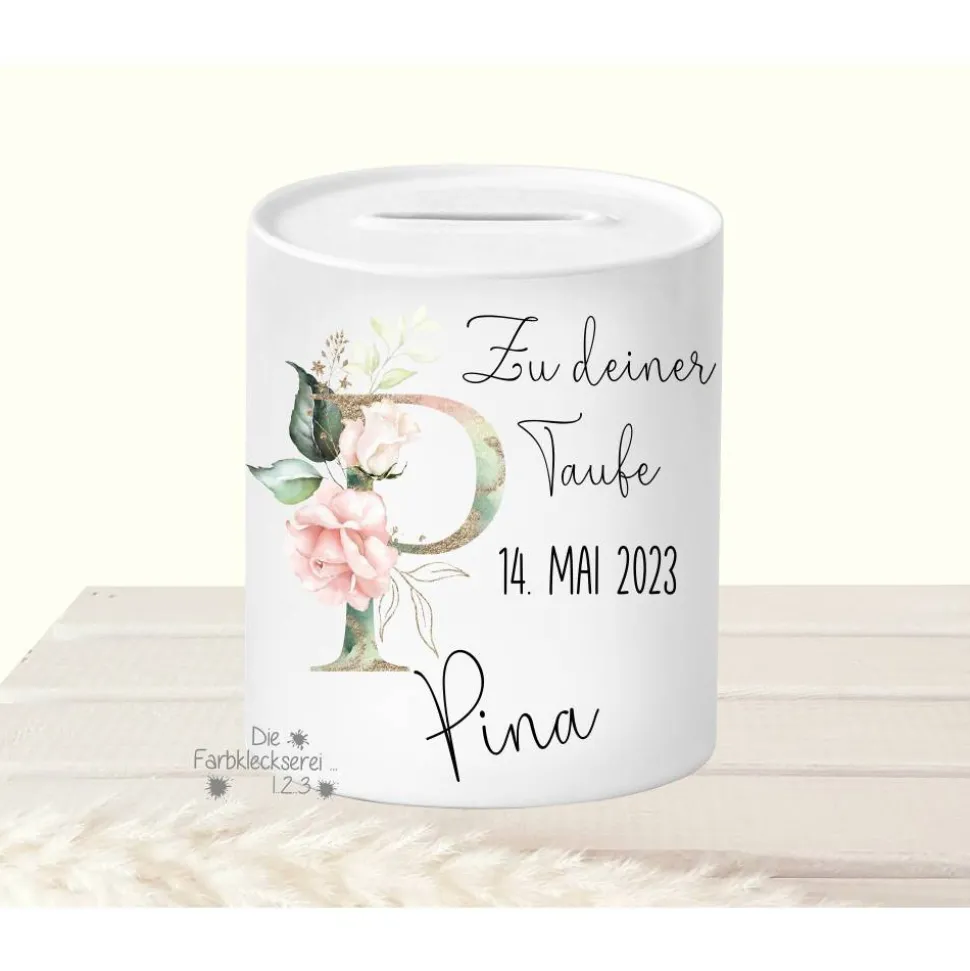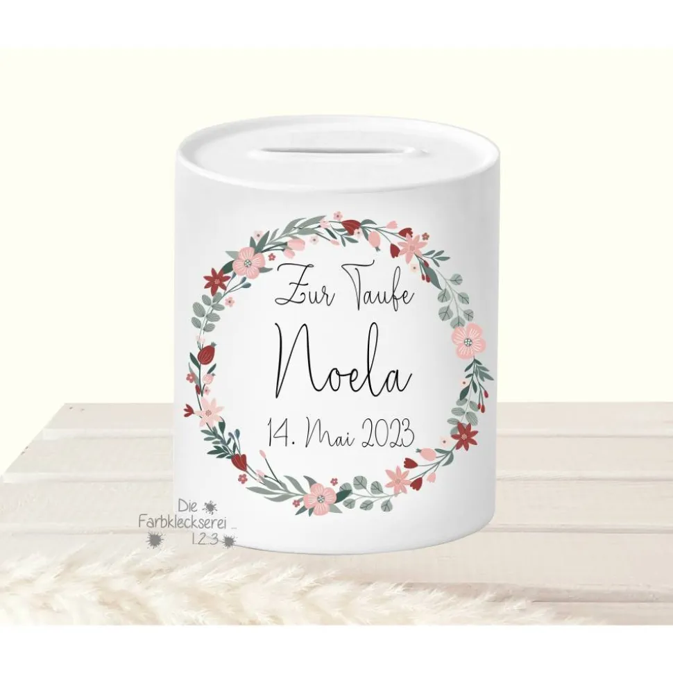 Zusätzlich wird das Sparschwein mit dem Taufdatum personalisiert