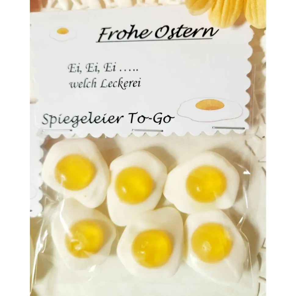Pro Artikel erhalten Sie ein Tütchen mit kleinen Fruchtgummi Spiegeleiern mit Orangengeschmack.