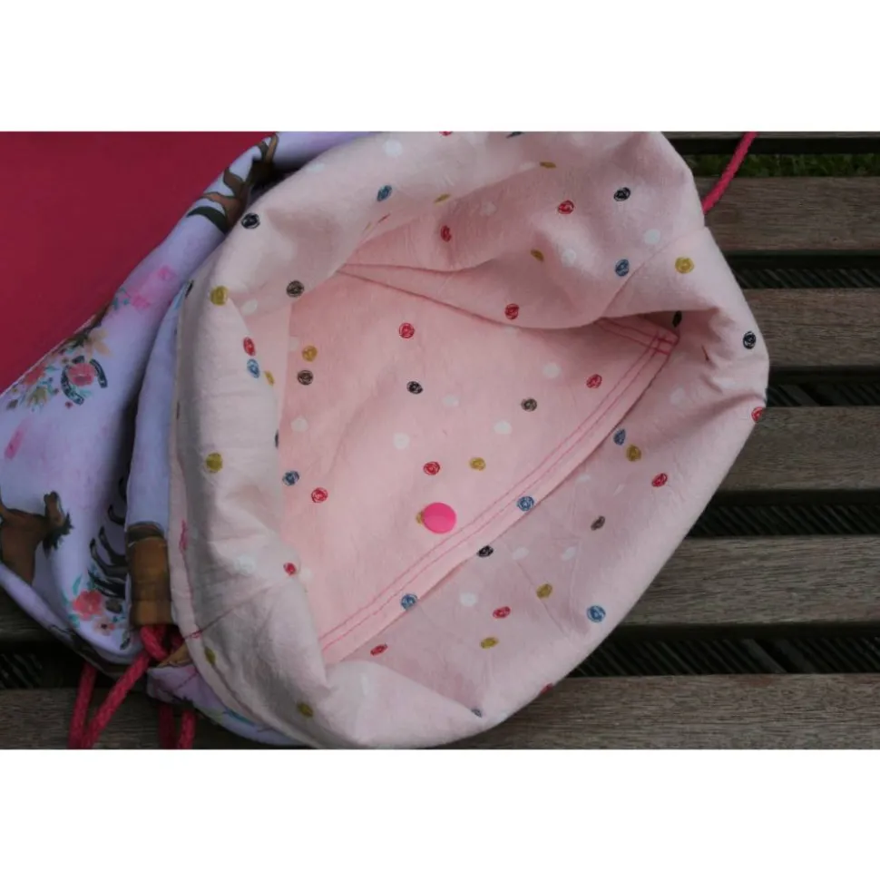 Das Futter aus Baumwolle ist rosagrundig mit vielen buntenten Punkten. Innen befindet sich auch noch kleines Fach das mit einem Druckknopf geschlossen werden kann.