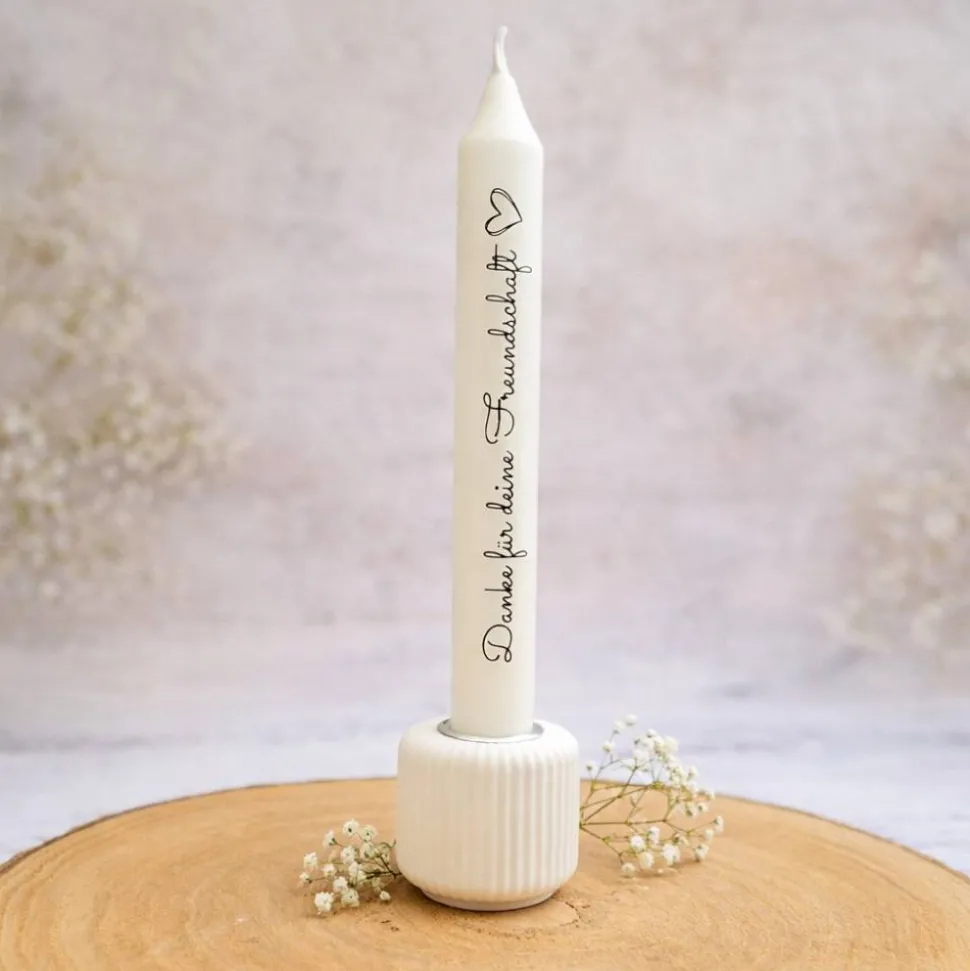 Diese handveredelten Stabkerzen sind ein schönes Geschenk für besondere Personen in deinem Leben– ob als Dankeschön, zum Geburtstag oder einfach, um jemandem zu zeigen, wie wichtig er oder sie ist. Die schlichte Eleganz der elfenbeinfarbenen Kerzen kombiniert mit der feinen Schrift macht sie zu einem zeitlosen Hingucker.