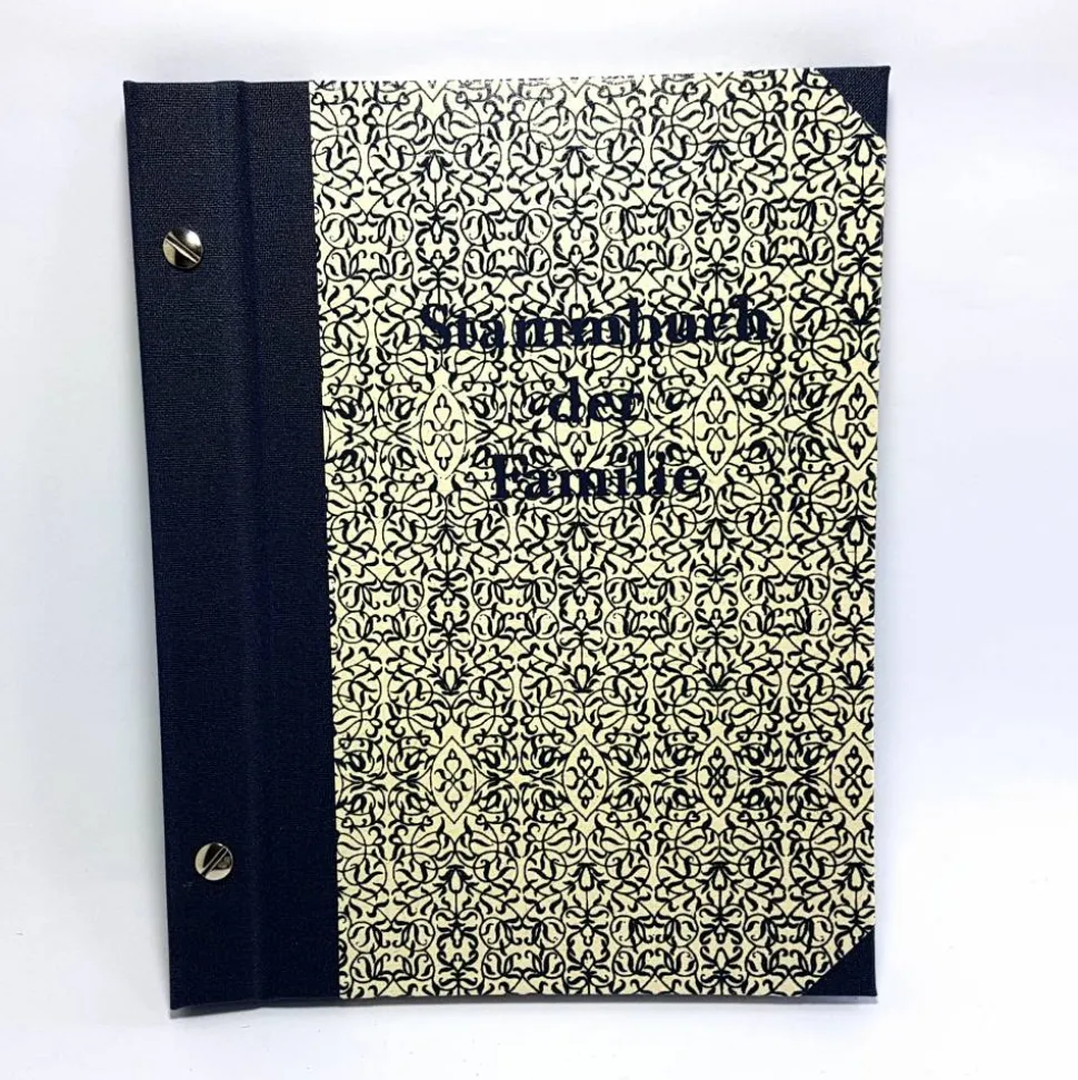 Das Stammbuch aus stabiler Buchbinderpappe ist am Rücken und den Ecken mit Buchbinderleinen bezogen. Das Überzugspapier ist Naturpapier.