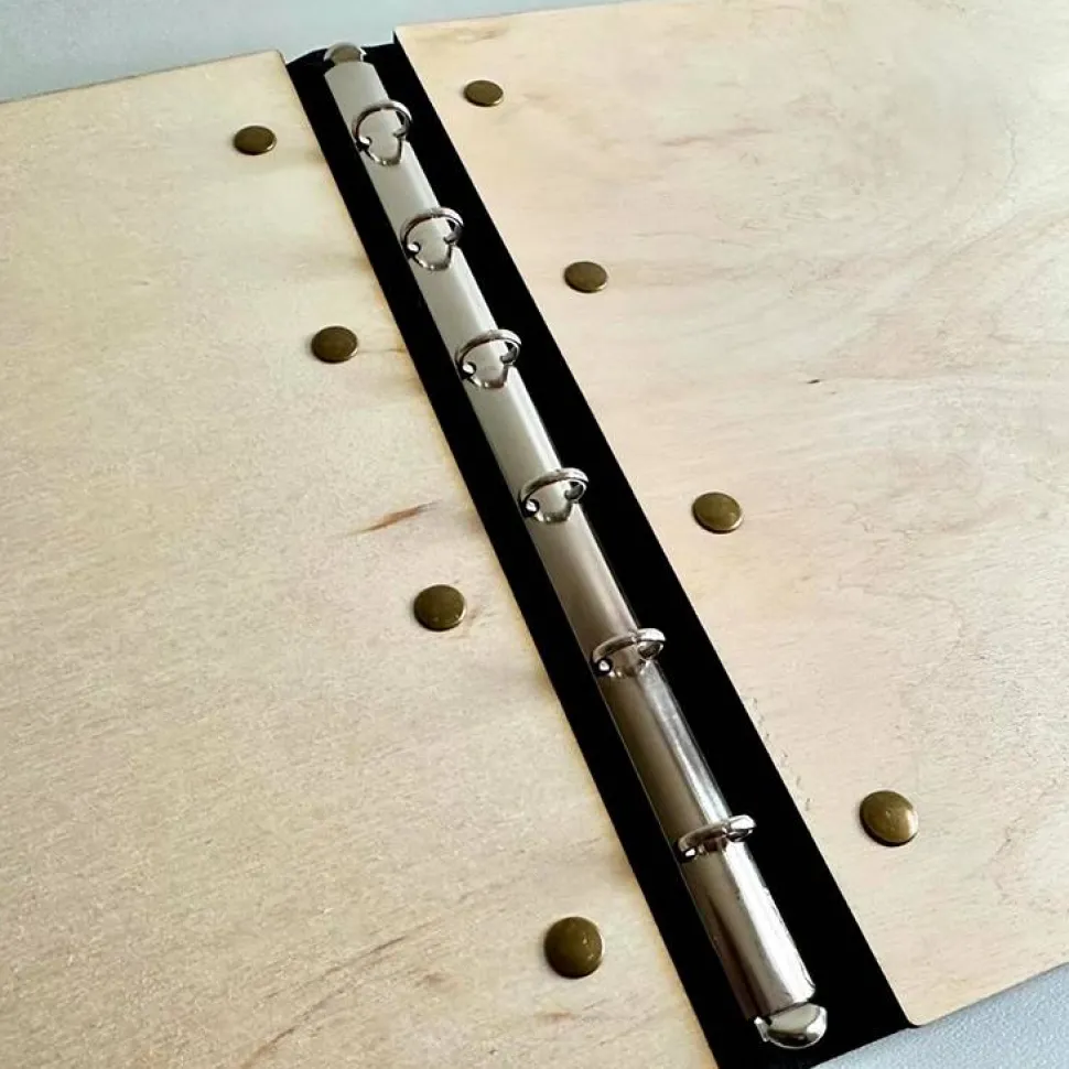 Das Holz wird geschliffen und geölt, der Ledereinband wird mittels Nieten befestigt und mit einer 6-fachen Ringmechanik speziell für Stammbücher ausgestattet.