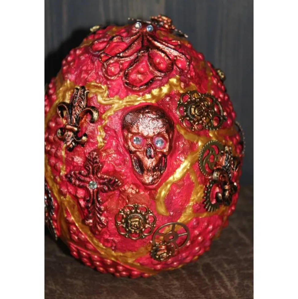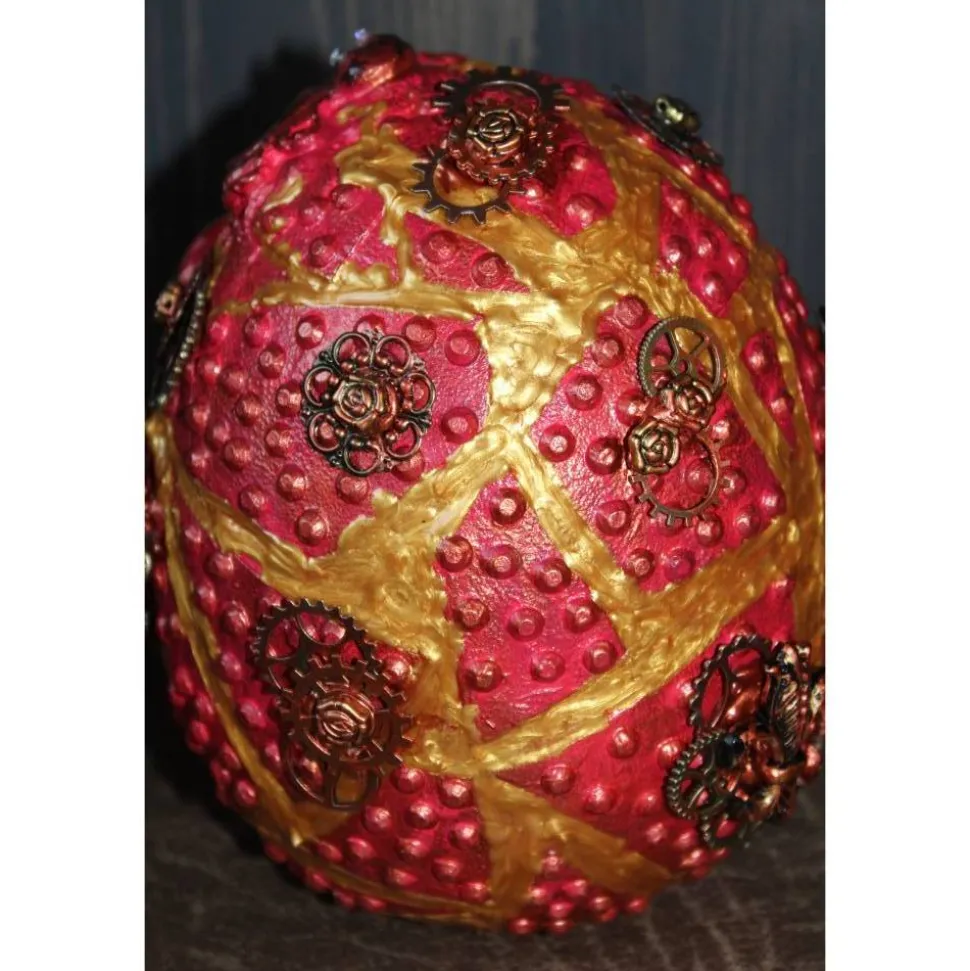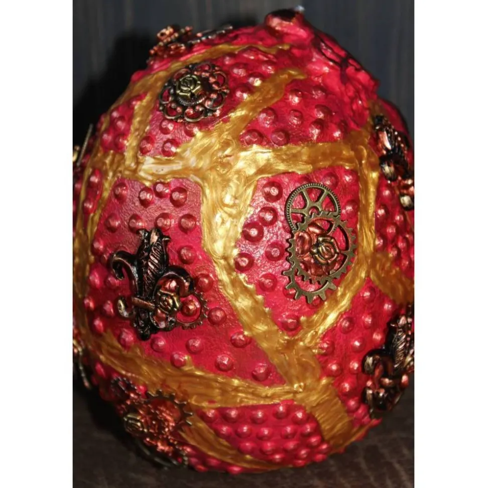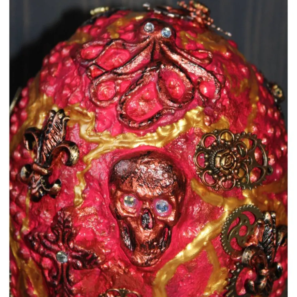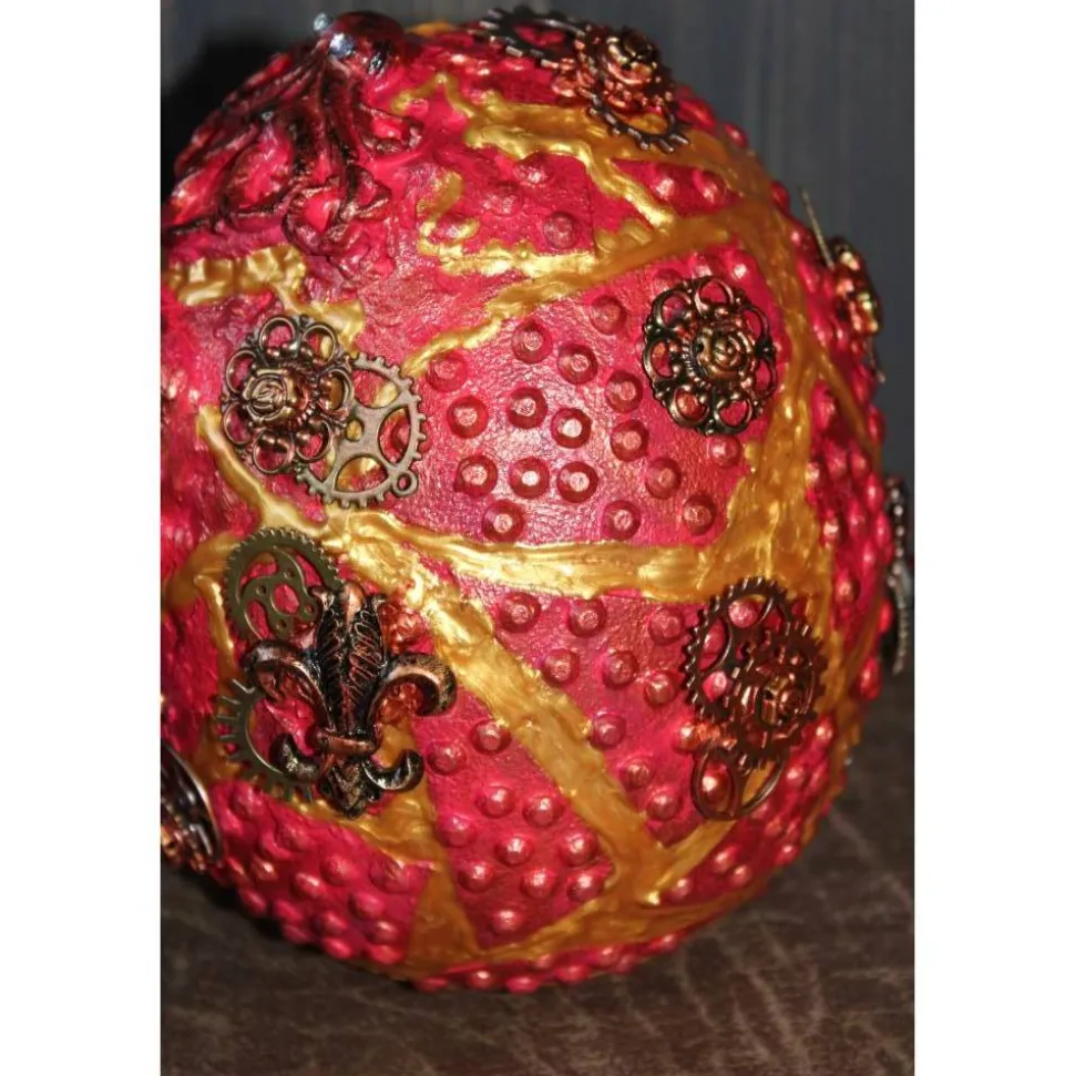 Deko-Ei aus Keramik im Steampunk-Stil. Verziert mit aus Modelliermasse geformtem Octopus, Totenkopf und Kreuz. Dekoriert mit unzähligen Applikationen aus Metall, Kunstleder und Kunststoff. Mit Acrylfarben in Rot, Gold und Schwarz gestaltet, witziges Künstler-Ei der etwas anderen Art! Tolle Vintage-Effekte durch Rissbildung in der Farbe.