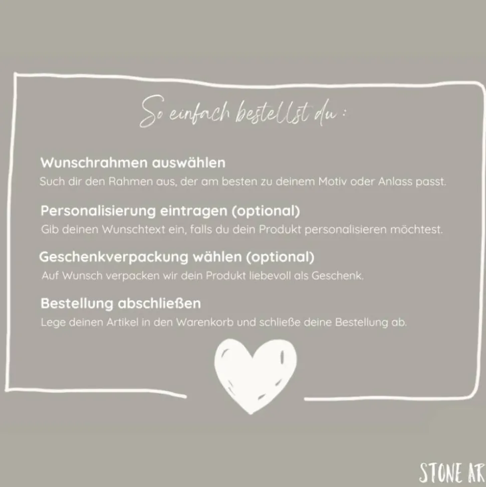 Du kannst zu deinem Steinbild eine passende Karte mit Kieselsteinchen hinzufügen. Sie ist nicht automatisch enthalten und muss separat bestellt werden. Die Karte ergänzt dein Geschenk stilvoll und bietet Platz für persönliche Grüße und Botschaften zur Eisernen Hochzeit.