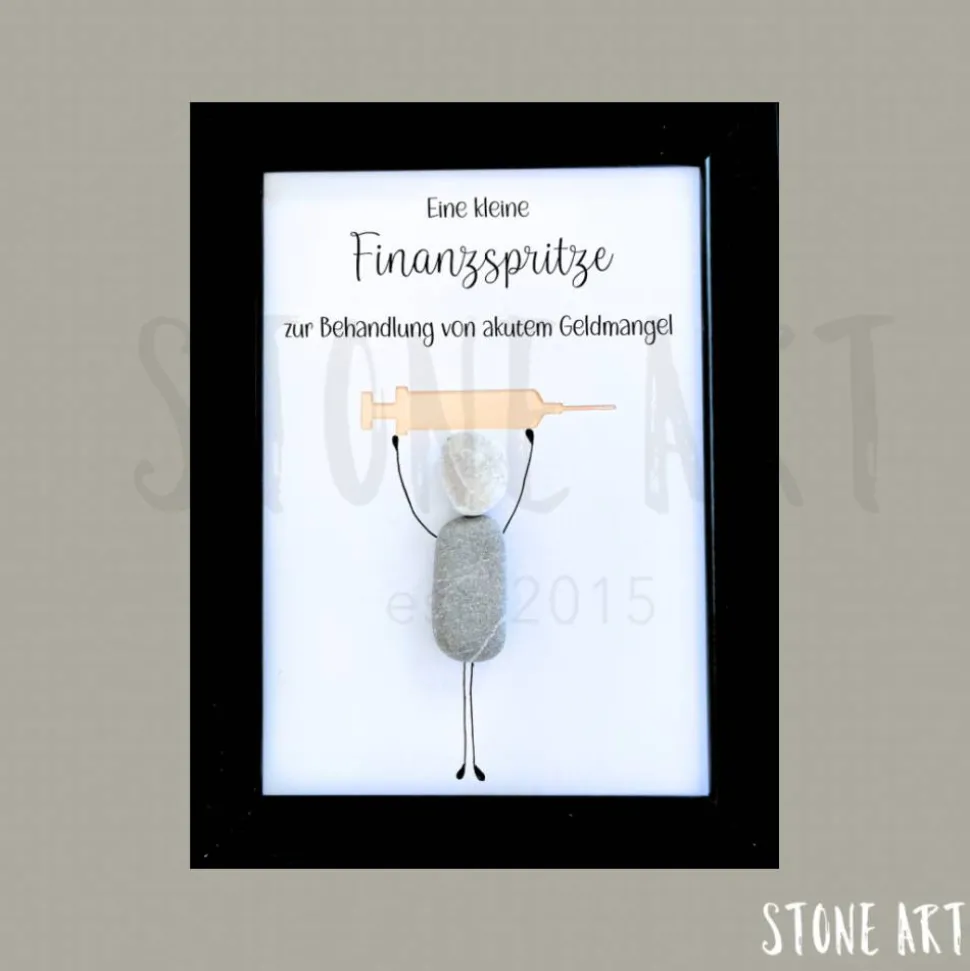 Verschenke die originelle „Finanzspritze“ – das kreative Steinbild als humorvolles Geldgeschenk! Die handgefertigte Kieselsteinfigur hält eine Spritze als witziges Symbol für die dringend benötigte Finanzspritze. Hinter der Spritze kannst du den Geldschein sicher platzieren. Der Rahmen lässt sich auf der Rückseite einfach öffnen, damit du das Geld einlegen kannst. Das abgebildete Geld dient nur zur Dekoration und ist nicht Bestandteil des Angebots.