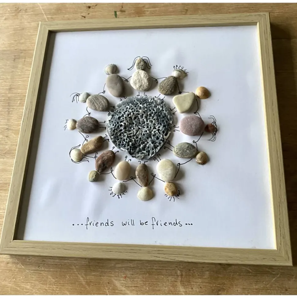 Schönes Bild aus Strandsteinen. Wir haben mit Steinen und Muscheln ein tolles Bild geklebt. Kleine Figuren, die sich an den Händen halten: Friends will be Friends.