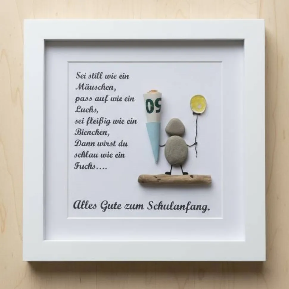 Ein wunderschönes handgefertigtes Steinbild zum Schulanfang – ideal als liebevolles Geldgeschenk zur Einschulung für ein Schulkind.