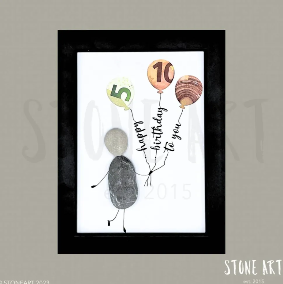 Überrasche zum Geburtstag mit einem einzigartigen Geldgeschenk: Das handgefertigte Steinbild „Happy Birthday to you“ mit Natursteinen und liebevollem Herzluftballon-Design ist die perfekte und kreative Geschenkidee.