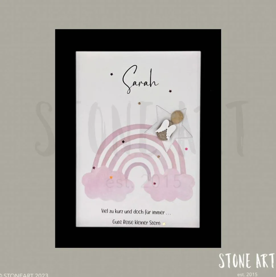 Jedes Bild ist ein Unikat und wird individuell nach deiner Bestellung gefertigt. Du kannst das Bild ganz nach deinen Wünschen anpassen. Optional lässt sich der Name des Sternenkindes in einem kleinen Stern integrieren – gib dazu deinen Personalisierungswunsch einfach direkt im entsprechenden Feld bei der Bestellung an.