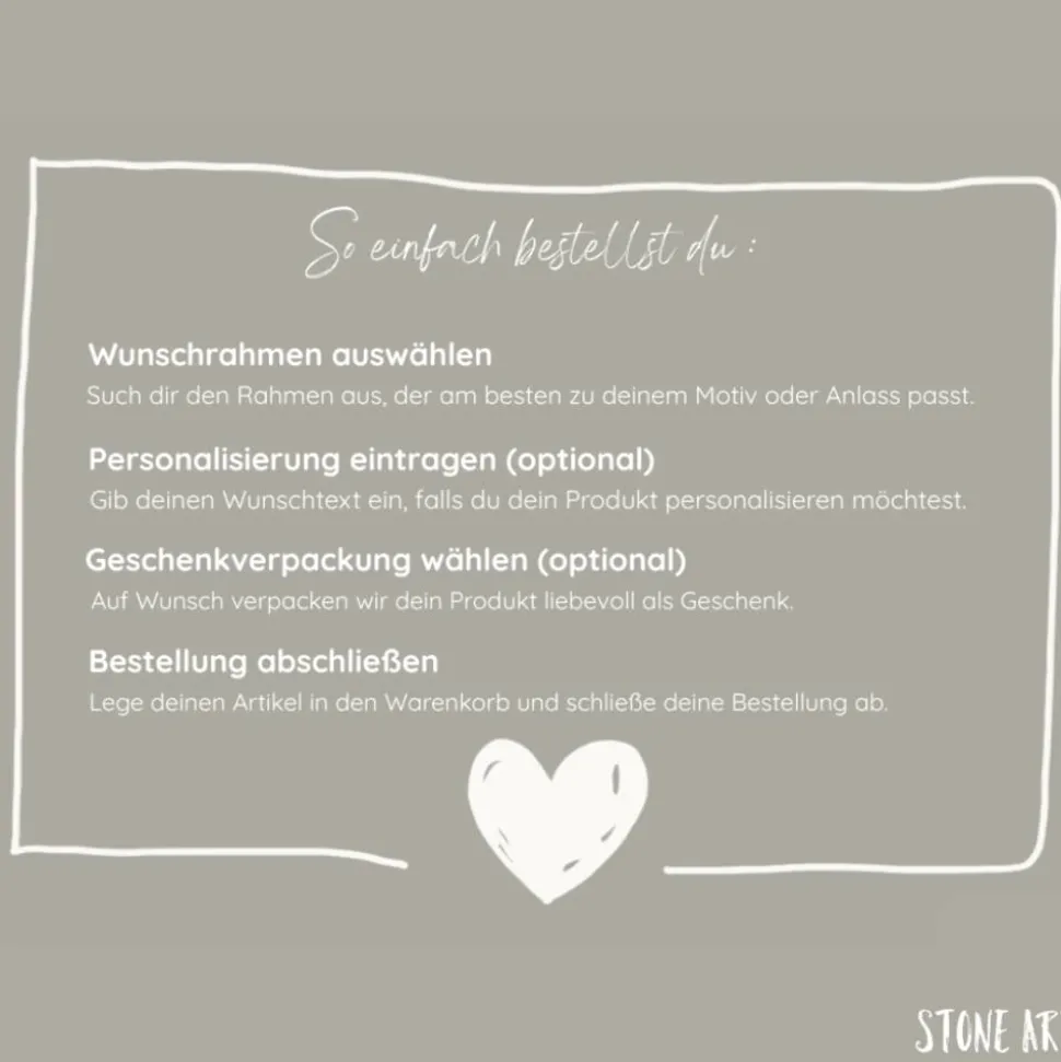 Die angegebenen Maße beziehen sich auf das Innenmaß des Bildes. Der Text sowie einzelne Elemente der Zeichnung werden direkt auf das Papier gedruckt. Du hast die Wahl zwischen verschiedenen Rahmen-Ausführungen: