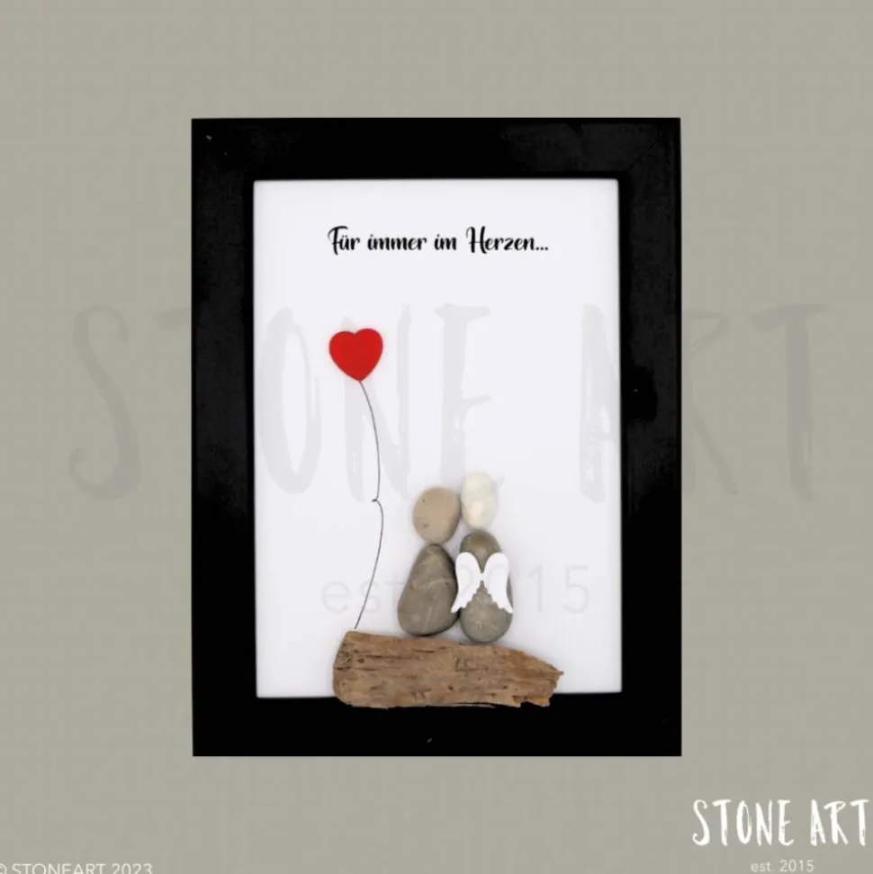 Ein einfühlsames Motiv aus echten Naturkieseln, das Trost spendet und die Erinnerung an einen besonderen Menschen bewahrt. Ein Geschenk, das zeigt: Der Tod nimmt einen Menschen aus unserer Mitte – aber niemals aus unseren Herzen.