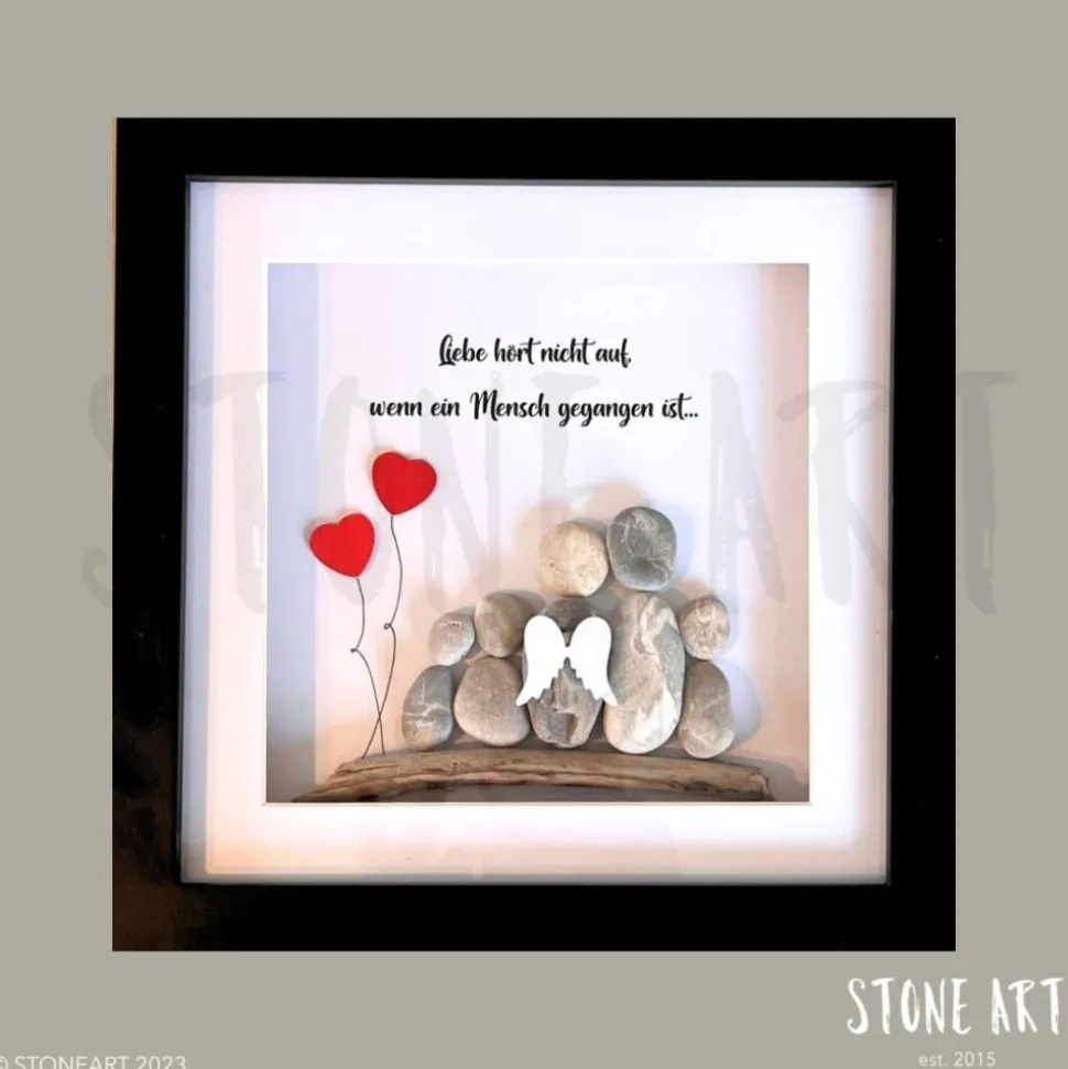 Ein einfühlsames Motiv aus echten Naturkieseln, das Trost spendet und die Erinnerung an einen besonderen Menschen bewahrt. Ein Geschenk, das zeigt: Der Abschied endet – die Liebe niemals.