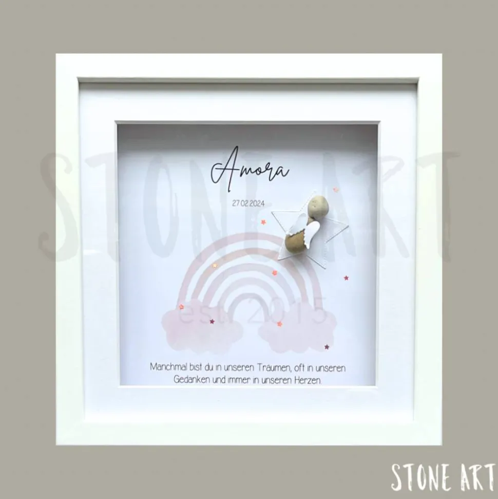 Handgefertigtes Steinbild für Sternenkinder – ein einzigartiges Andenken, das speziell für dich und dein Sternenkind angefertigt wird. Mit dem liebevollen Spruch: „Manchmal bist du in unseren Träumen, oft in unseren Gedanken und immer in unserem Herzen.“ drückst du deine tiefe Verbundenheit aus, die Zeit und Raum überdauert.
