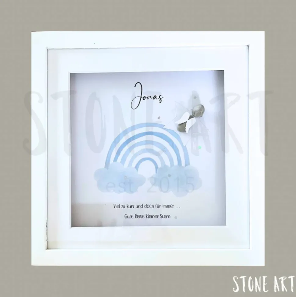 „Viel zu kurz und doch für immer“ – dieses handgemachte Steinbild in zartem Blau ist ein einfühlsames Erinnerungsgeschenk für Menschen, die jemanden viel zu früh verloren haben.