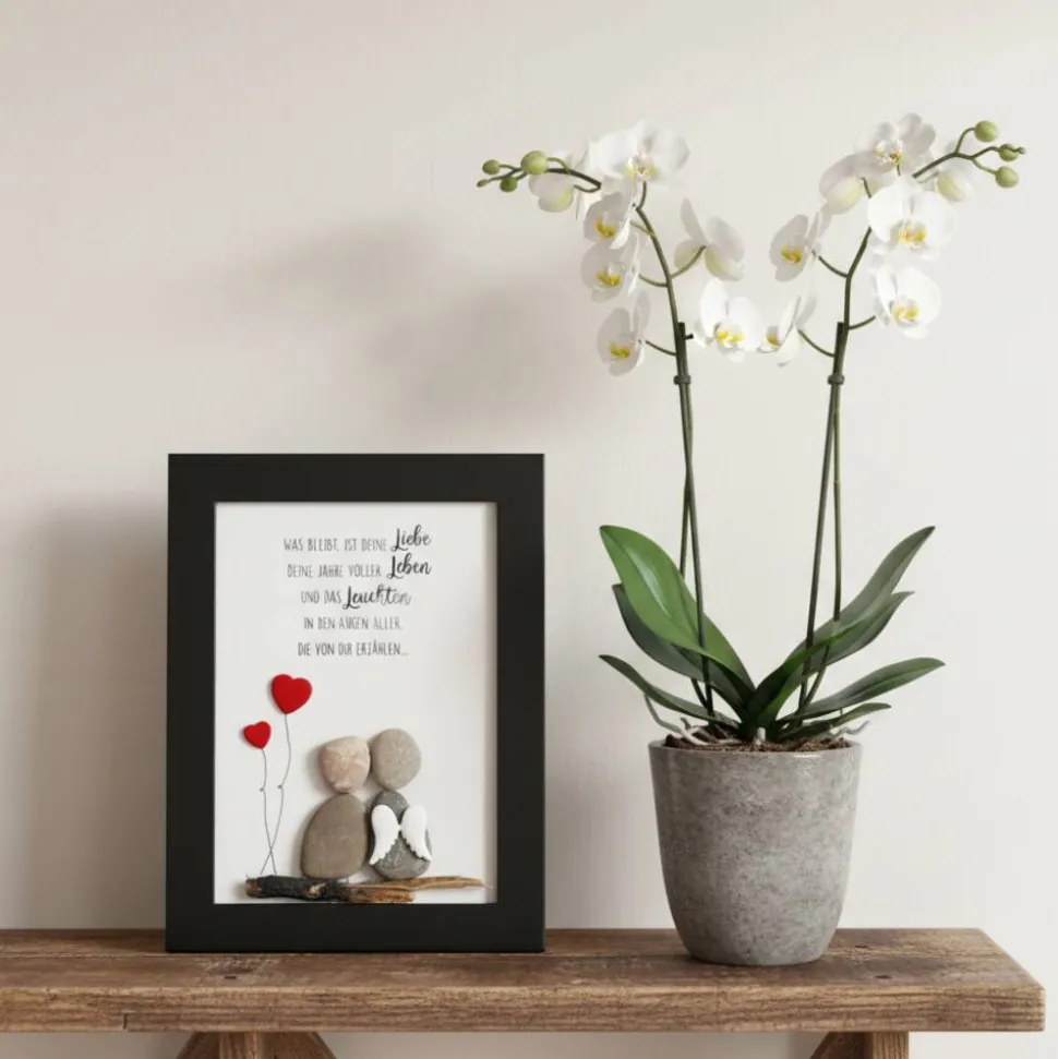 Ein einfühlsames Motiv aus echten Naturkieseln, das Trost spendet und die Erinnerung an einen besonderen Menschen bewahrt. Ein Geschenk, das zeigt: Menschen gehen, aber ihre Liebe bleibt – für immer und unvergessen.