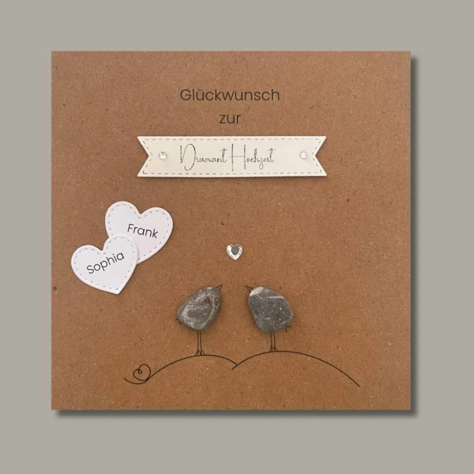Zu deinem Steinbild kannst Du eine passende Karte mit Kieselsteinchen auswählen. Bitte beachte, dass diese nicht automatisch im Lieferumfang enthalten ist und separat bestellt werden muss. Die Karte ergänzt dein Geschenk ideal und bietet Platz für persönliche Worte, Glückwünsche zur Diamantenen Hochzeit oder einen liebevollen Spruch zum 60. Hochzeitstag.