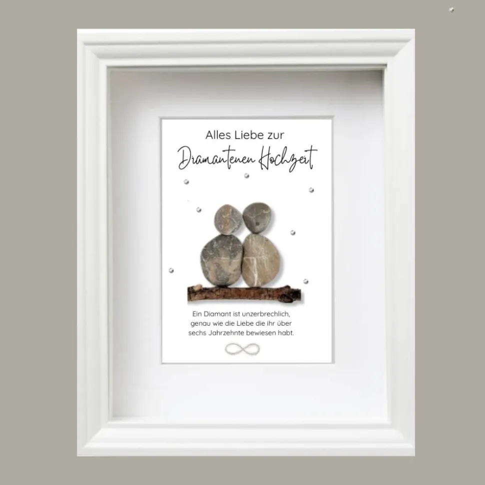 Feiere die Diamantene Hochzeit, den 60. Hochzeitstag, mit einem ganz besonderen handgefertigten Steinbild als Geschenk. Sechzig gemeinsame Ehejahre stehen für eine außergewöhnliche Lebensleistung, tiefe Verbundenheit und Beständigkeit – Werte, die dieses Steinbild auf liebevolle und stilvolle Weise widerspiegelt.