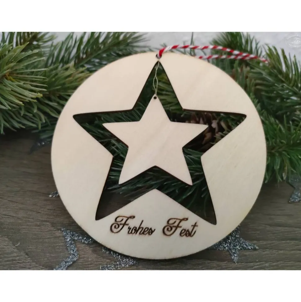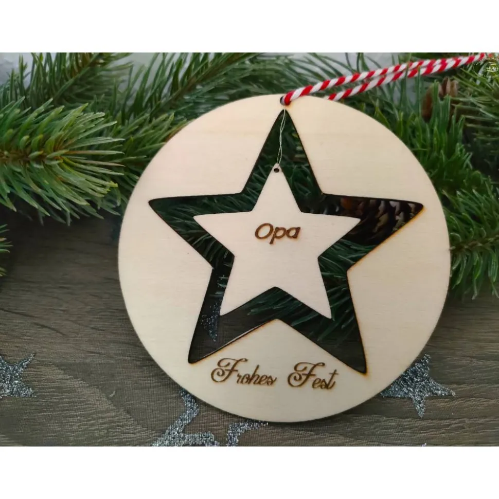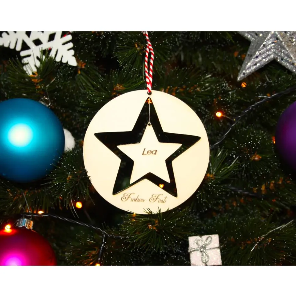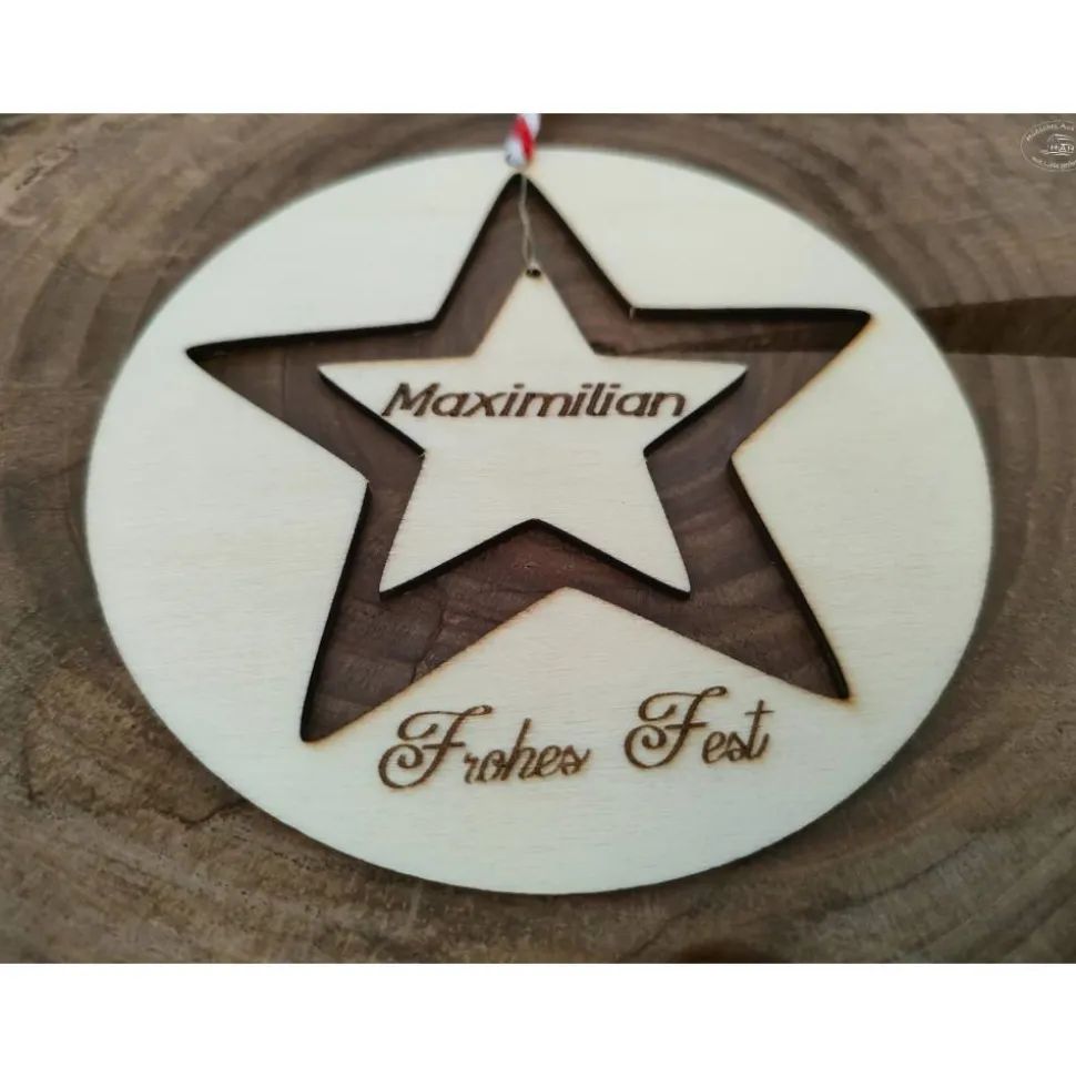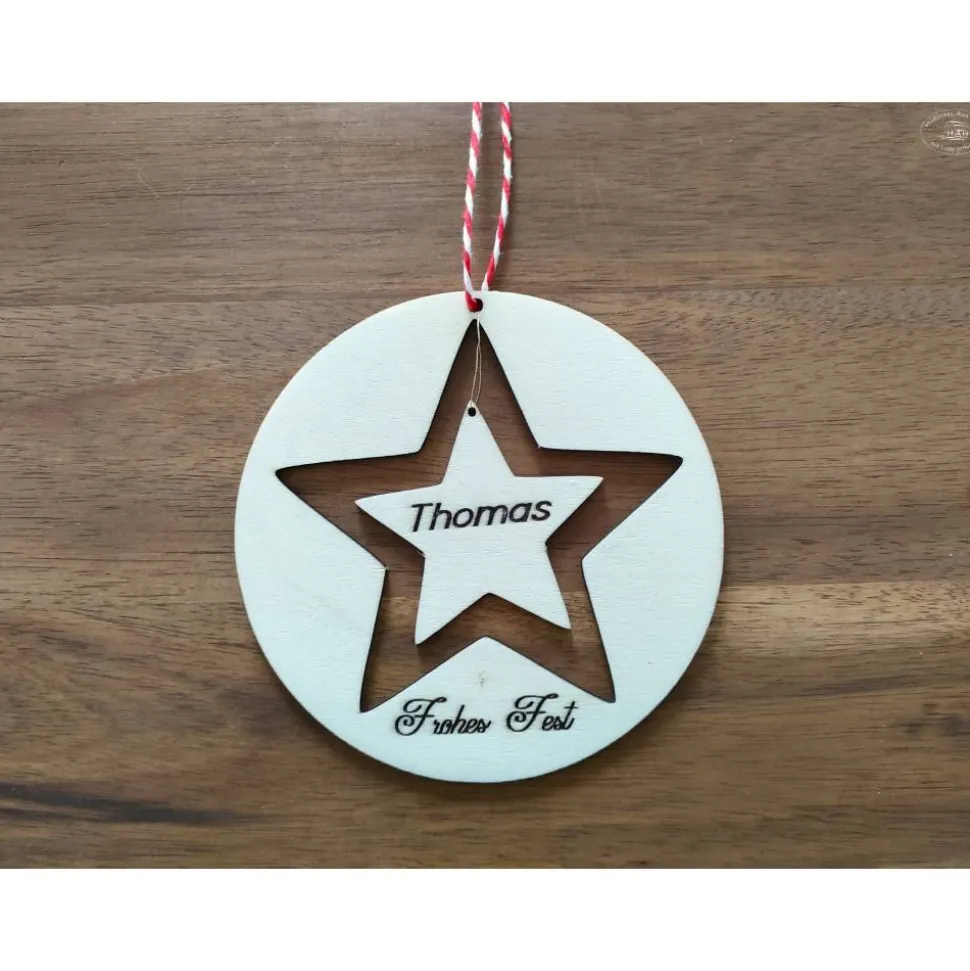 Stern-Anhänger“ Frohes Fest“ mit rot-weißer Baumwollkordel, beidseitiggraviert und mit Name im kleinen Stern personalisiert.