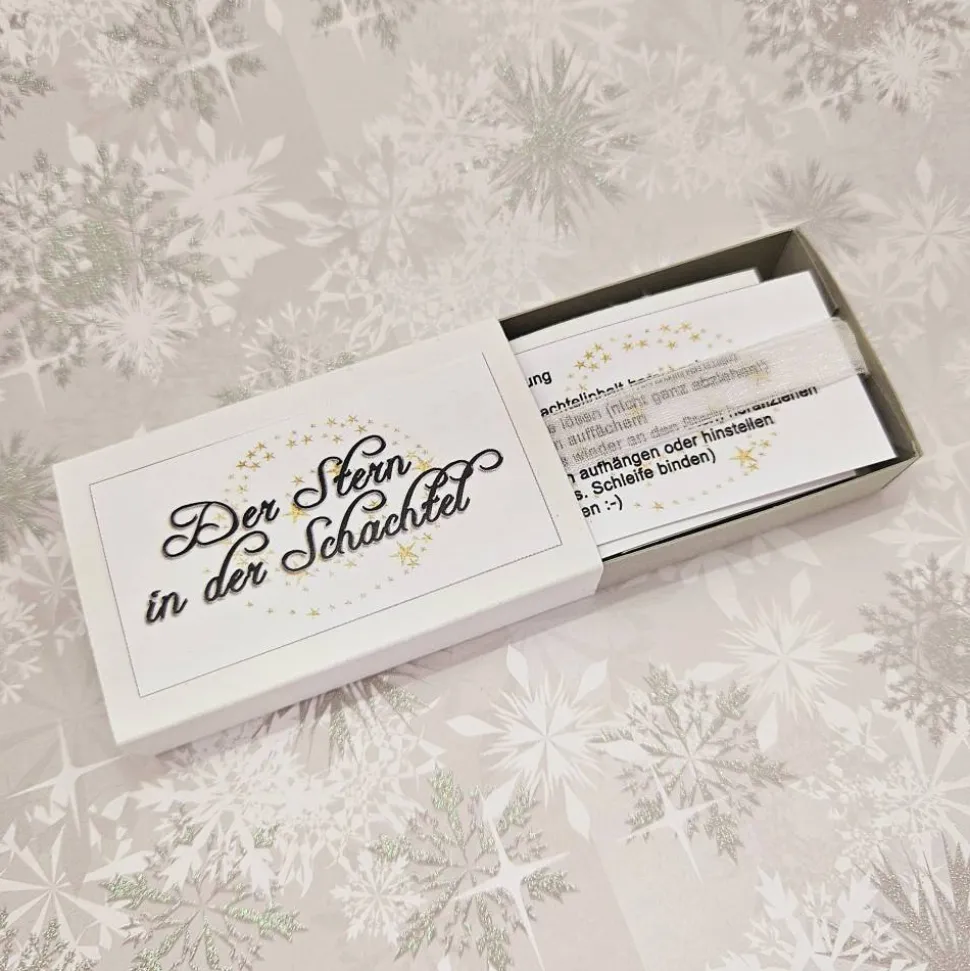 Präsentiert wird der Stern in einer liebevoll gestalteten Schiebeschachtel mit dem Schriftzug „Der Stern in der Schachtel“. Im Inneren befindet sich eine klare Anleitung, die zeigt, wie der Stern entfaltet, mit der Perle fixiert und aufgehängt wird. Diese Farbvariante passt besonders gut zu moderner Weihnachtsdeko, skandinavischen Einrichtungsstilen oder als dezente, hochwertige Aufmerksamkeit für besondere Menschen.