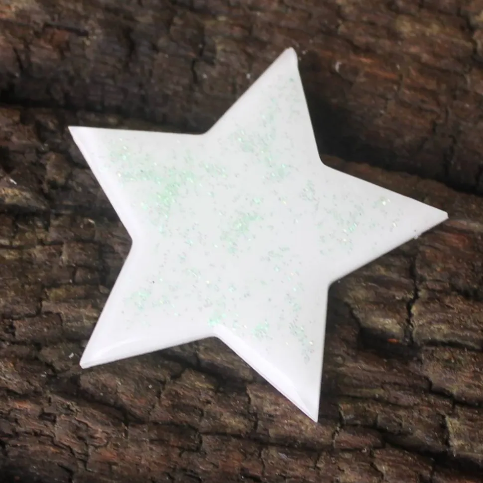 Der Stern ist ca. 6 cm groß und weiß eingefärbt. Auf der Unterseite gibt es grünen Glitzer und der Stern ist türkis. Ich habe ihn für eure Gedenkecke angefertigt.