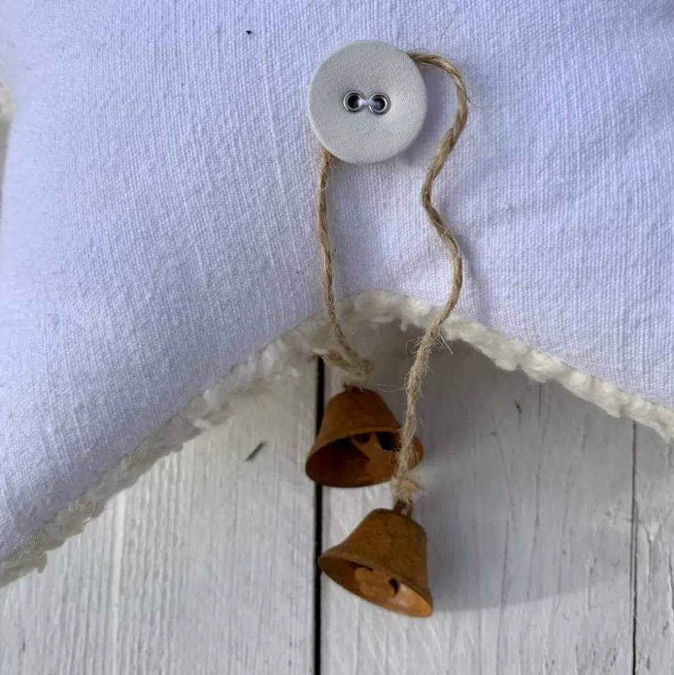 Zwei kleine rostfarbene Metallglöckchen sind an einem mit Leinenstoff bezogenen Stoff angebracht.