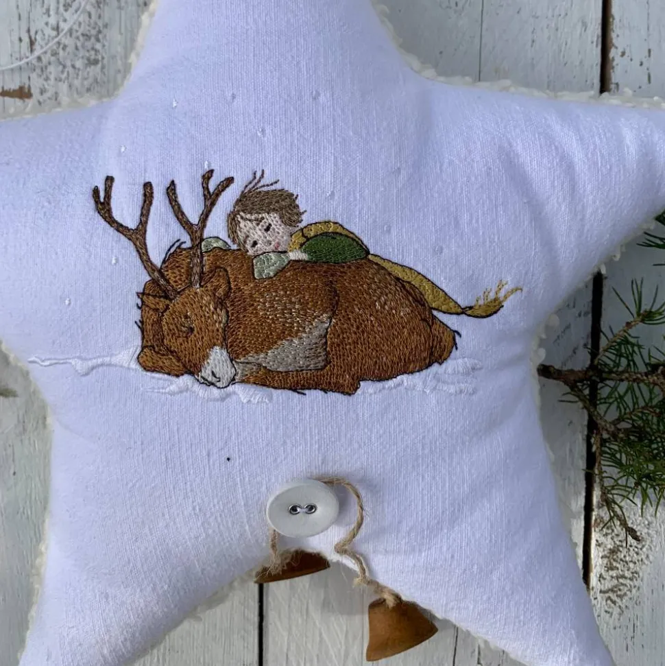 Großer Stern auf einem rustikalen altweißen Stoff gestickt, Stoffstern in harmonischen dezenten Farben.