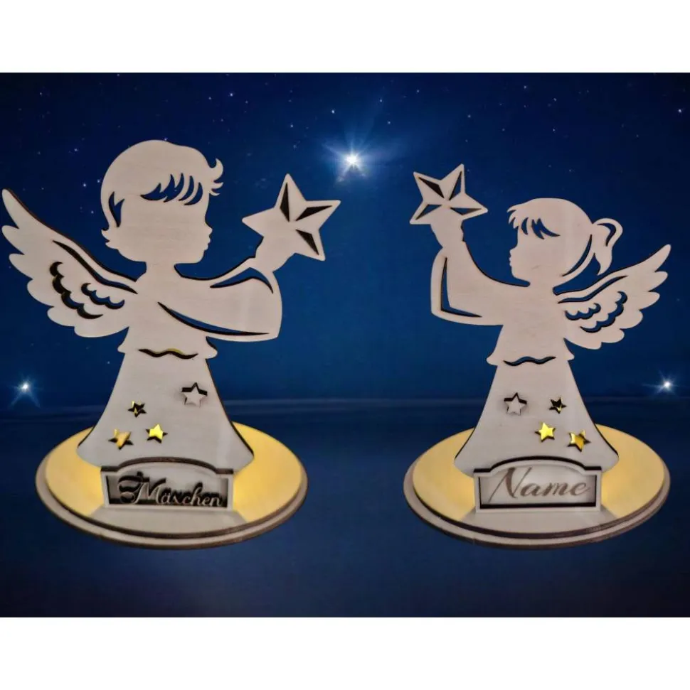 → Holzengel als Junge oder Mädchen, auf Wunsch mit geschnittenem Namen oder mit graviertem Namen, (Bitte beachten, dass beim geschnittenen Namen, die Schrift nicht zu sehr verkleinert werden kann, da es dann zu filigran zum verkleben wird, lange Namen oder Doppelnamen können somit schwierig werden und eignen sich als Gravur besser)
