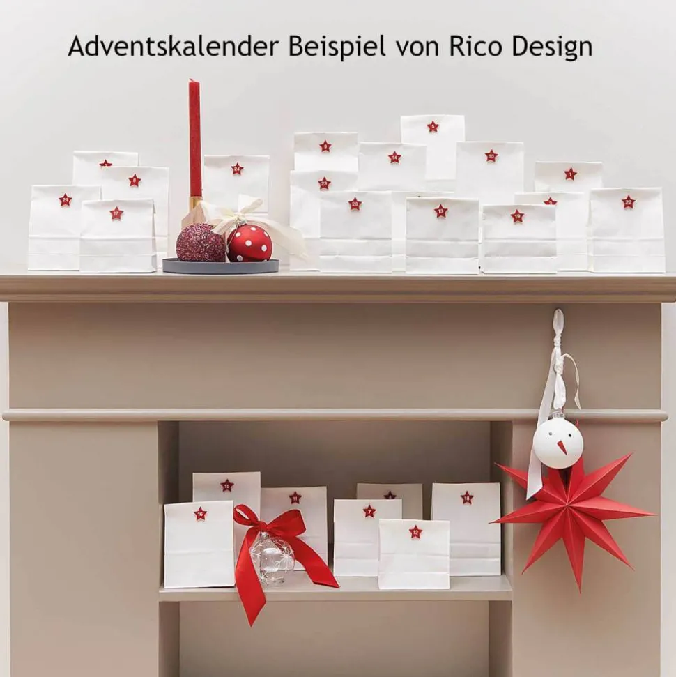 Auf den Holzstickern sind die Zahlen für den Adventskalender aufgebracht. Die Sternchen sind a. 25 x 24 mm groß. Die Adventskalenderzahlen aus Holz können direkt auf Geschenktüten oder Schachteln geklebt werden.