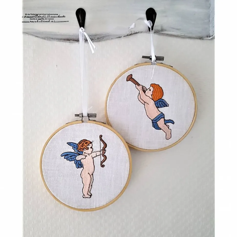 Verleihe deinem Zuhause eine besondere Note mit diesem liebevoll handgefertigten Stickbild. Der süße Engel mit Bogen oder Flöte ist detailreich auf hochwertigem Leinen gestickt und macht das Bild zu einer einzigartigen Wanddekoration.