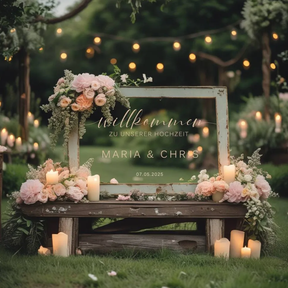 „Willkommen zu unserer Hochzeit“, zwei Namen und ein Datum.