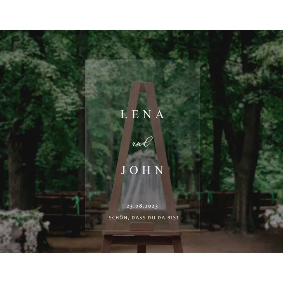 „Willkommen zu unserer Hochzeit“, zwei Namen und ein Datum.