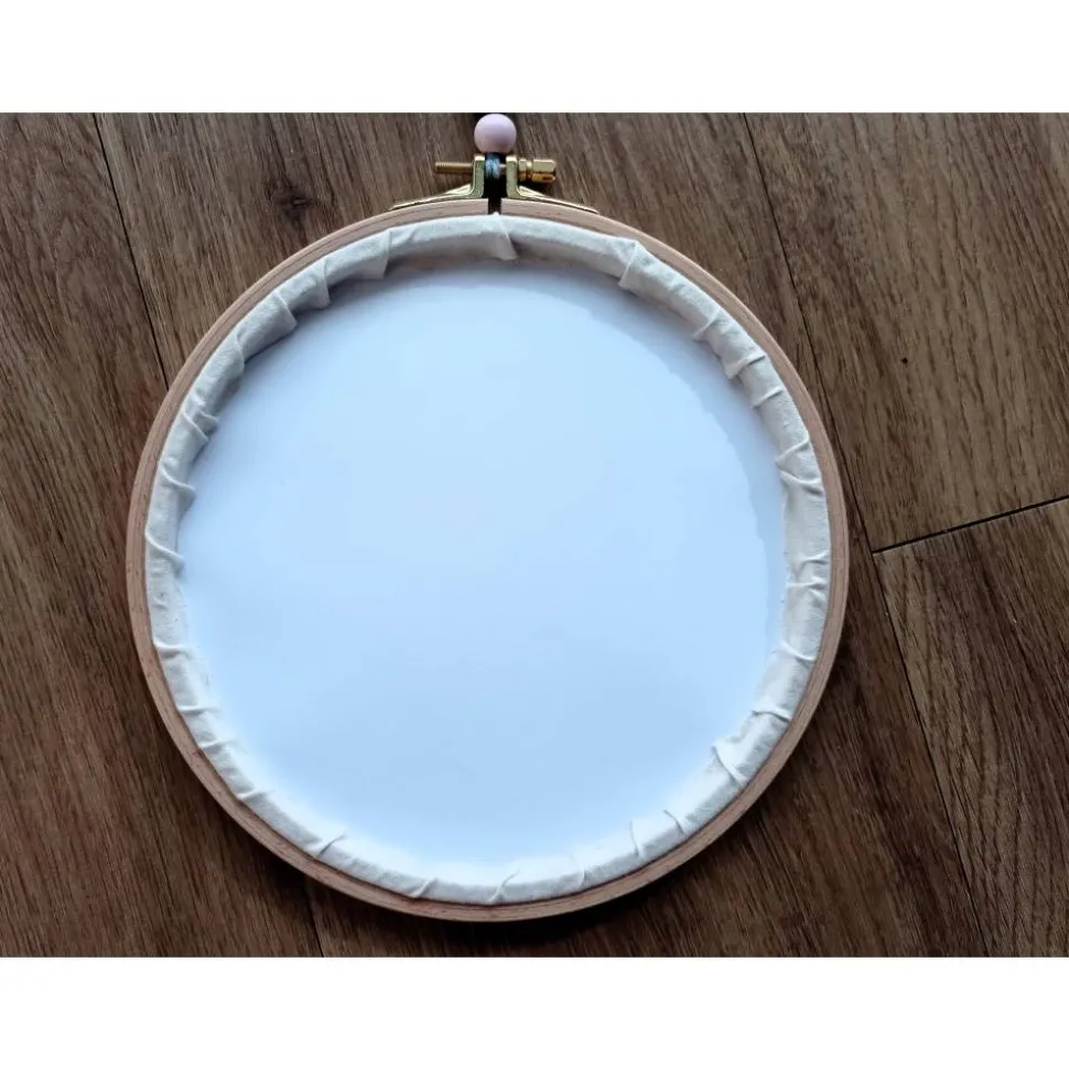 Den Baumwollstoff besticke ich mit meiner Stickmaschine nach individuellen Vorgaben. Gerne kann auch die Stickgarnfarbe gemäß beigefügter Farbkarte angepasst werden. Der Rahmen ist am Verschluss mit einem Baumwollband und Holzkugeln verziert.