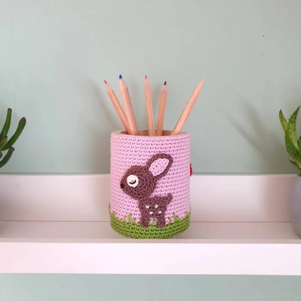 Entdecke den liebevoll umhäkelten Stiftebecher mit Reh und Fliegenpilz von Savö-Design!
