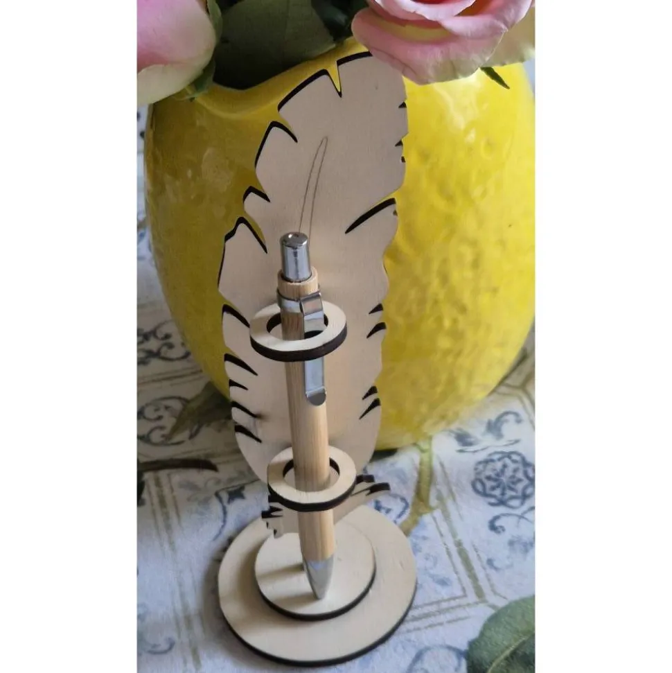 Entdecke diesen tollen Stiftehalter in Federform, gefertigt aus 4mm Bastelholz. Der Stiftehalter bietet sicheren Halt für deinen Kugelschreiber und ist ein echter Blickfang auf jedem Schreibtisch. Die Maße sind: Höhe 19cm, Breite Feder 5cm, Sockel rund ca 7cm.